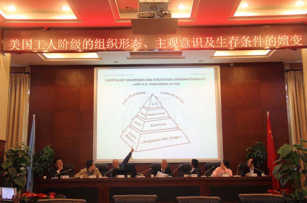 在我院国外马克思主义政党研究中心主任、资深学者聂运麟教授对主讲嘉宾做了简单的介绍之后,哈拉比教授开始了他精彩的演讲,科学社会主义研究所余维海教授作为同声翻译全程陪同。本次哈拉比教授的演讲主题是“A Short Overview of Changes in the Conditions, Consciousness and State of Organization of the Working Class in US”,他主要从美国工人阶级嬗变的客观条件与组织形态两个方面切入,对主题进行了阐述。