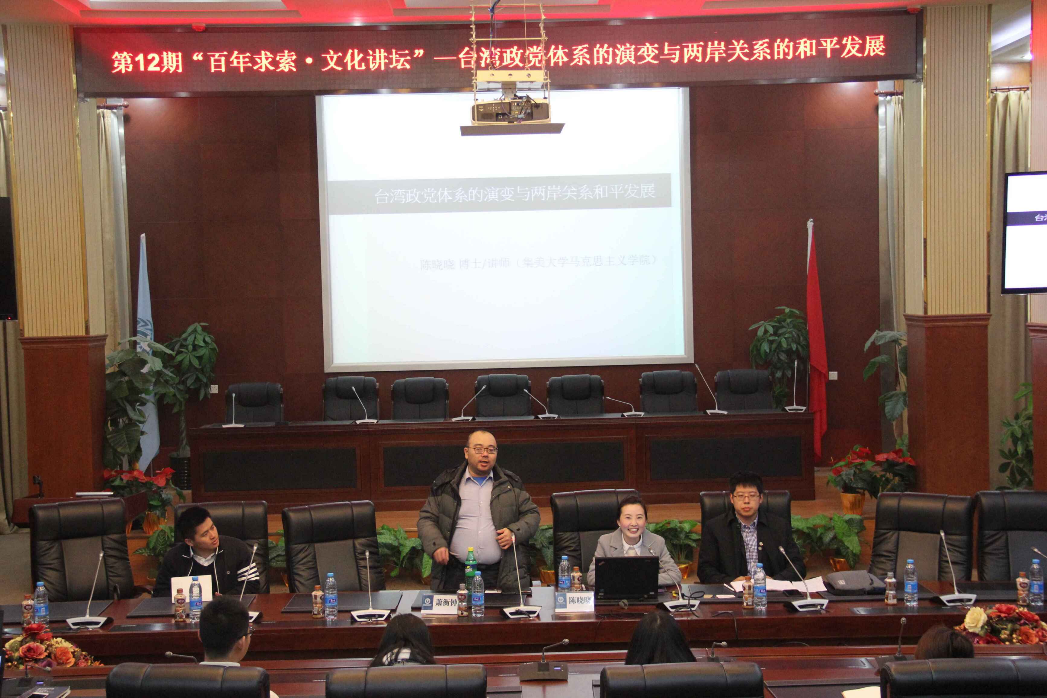 (通讯员 刘烨)3月15号晚七点,华中师范大学第12期“百年求索·文化讲坛”在模拟联合国实验室(老图书馆四楼)举办。本期文化讲坛由华中师范大学研究生会主办,政治与国际关系学院研究生会和公共管理学院研究生会承办,马克思主义学院研究生会与法学院研究生会协办。讲座主题为台湾政党体系的演变与两岸关系和平发展,我院萧衡钟老师主持讲坛,杨明勋(复旦大学国际关系与公共事务学院博士)以及林士清(台湾经济研究院助理研究员、清华大学公共管理学院博士)出席讲座并担任点评嘉宾,约一百名同学参加本期讲坛。