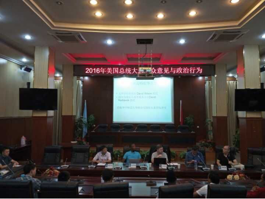 (通讯员张德林)9月20日下午,美国特拉华大学的政治学者——David Redlawsk教授、David Wilson教授受政治与国际关系学院邀请,在模拟联合国开展了 “2016年美国大选群众意见与政治行为”的专题讲座。副院长胡宗山教授代表学院对两位教授的到来表示热烈的欢迎,刘明周副教授主持活动。来自于国际政治、国际关系、科学社会主义与国际共产主义运动等专业的50余名研究生以及部分留学生集体参加了本次学术交流活动。