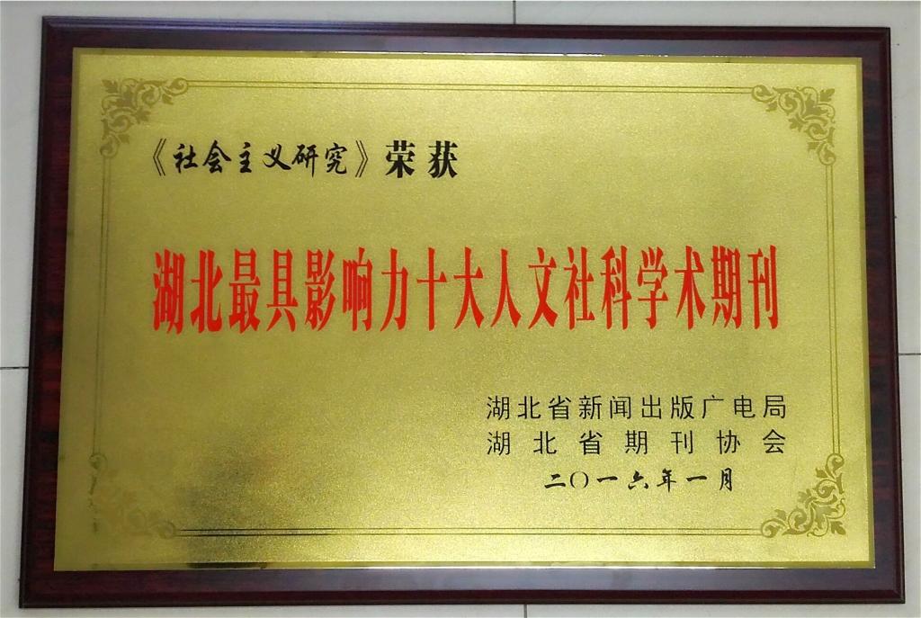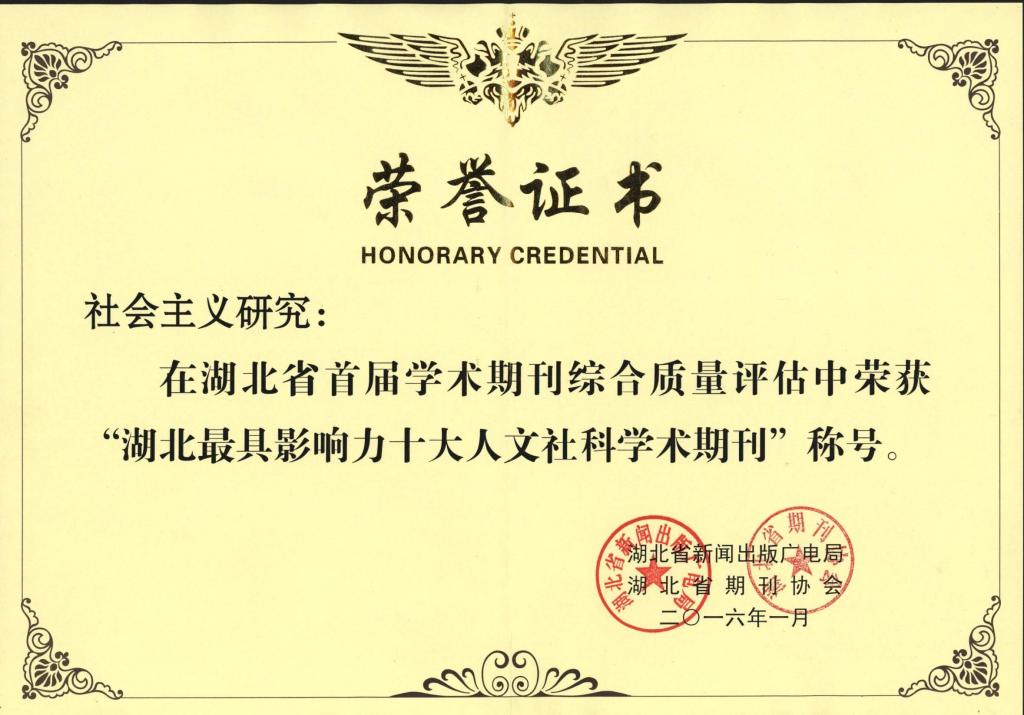 本届湖北省学术期刊综合质量评估工作是根据《湖北省新闻出版广电局关于开展全省学术期刊综合质量评估工作的通知》([2015]43号)的要求,于2015年5月启动,至2015年12月12日结束。本次评估活动经过调研和制定评估方案、申报和采集评估数据、协会专委会初评和专家委员会复评三个阶段的工作,对经国家新闻出版广电总局认定的第一批学术期刊进行了评估,最终评估出全省270种学术期刊的综合质量得分。我院《社会主义研究》在270种学术期刊的综合质量得分排名第八,荣获“湖北最具影响力十大人文社科学术期刊”称号。