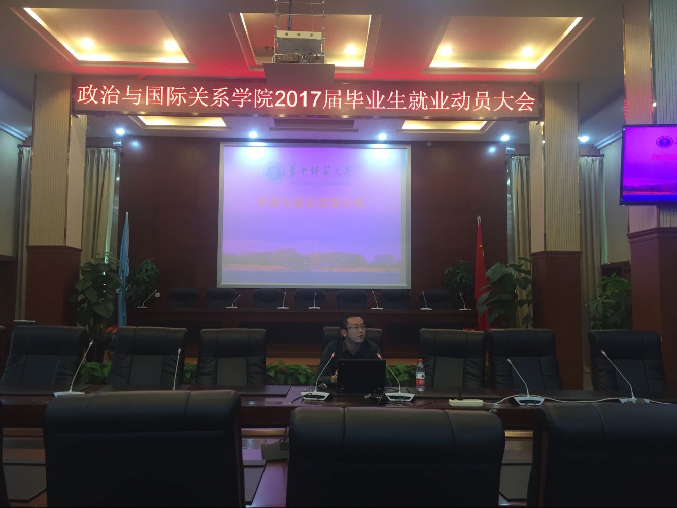 (通讯员 张德林)10月9日下午,政治与国际关系学院2017届毕业生就业动员大会在模拟联合国(老图书馆4楼)召开。我院党政办主任、研究生辅导员潘广炜老师针对“研究生就业”专题,为参加本次会议的100余名硕士研究生,做了一场详细且别开生面的宣讲会。