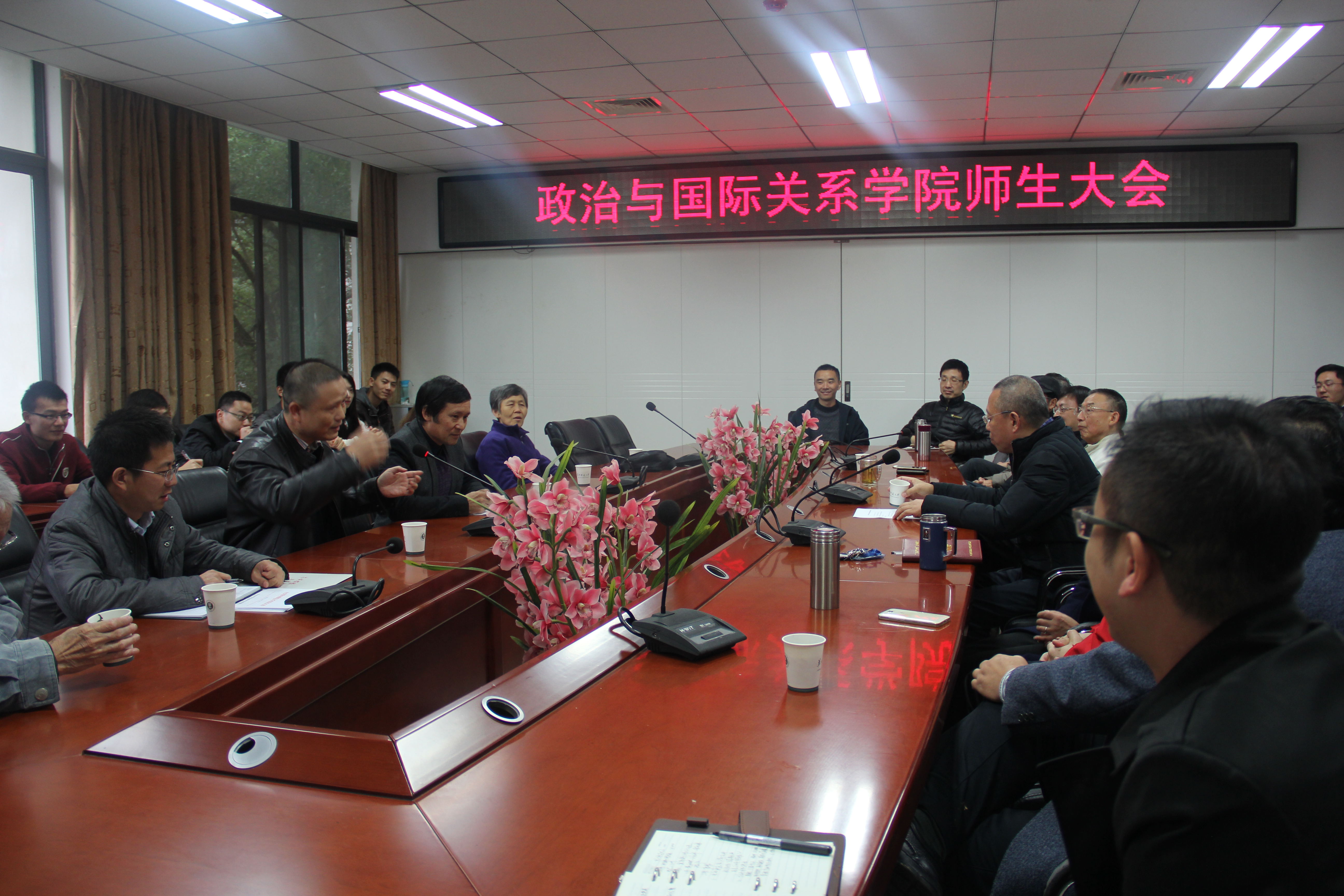 (通讯员 朱潇潇)11月8日下午,政治与国际关系学院师生大会在院309会议室召开。副校长黄永林教授、党委宣传部王长华部长、组织部朱庆海副部长,我院全体教职工、离退休教师代表、学生代表出席本次会议,会议由我院院长唐鸣教授主持。