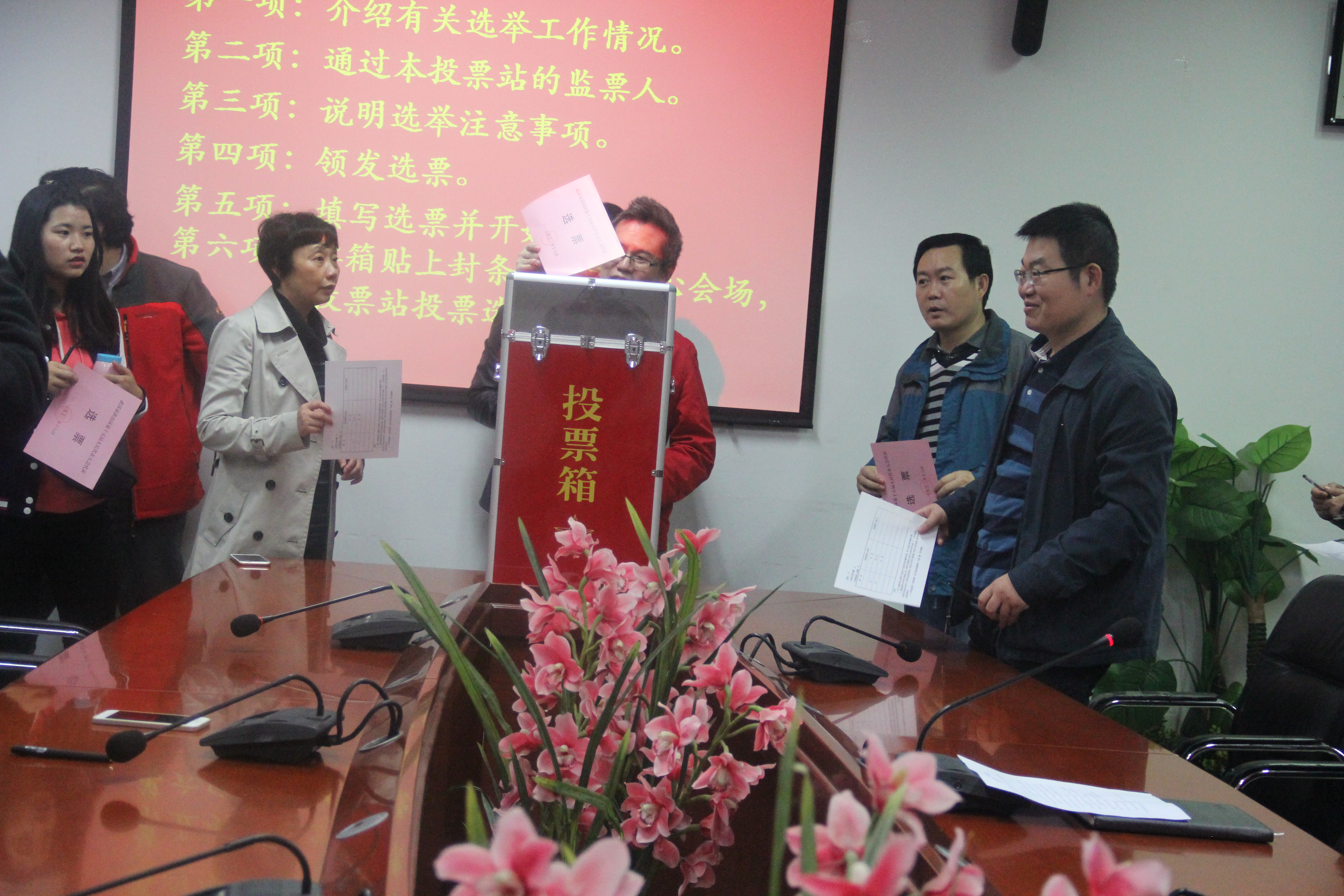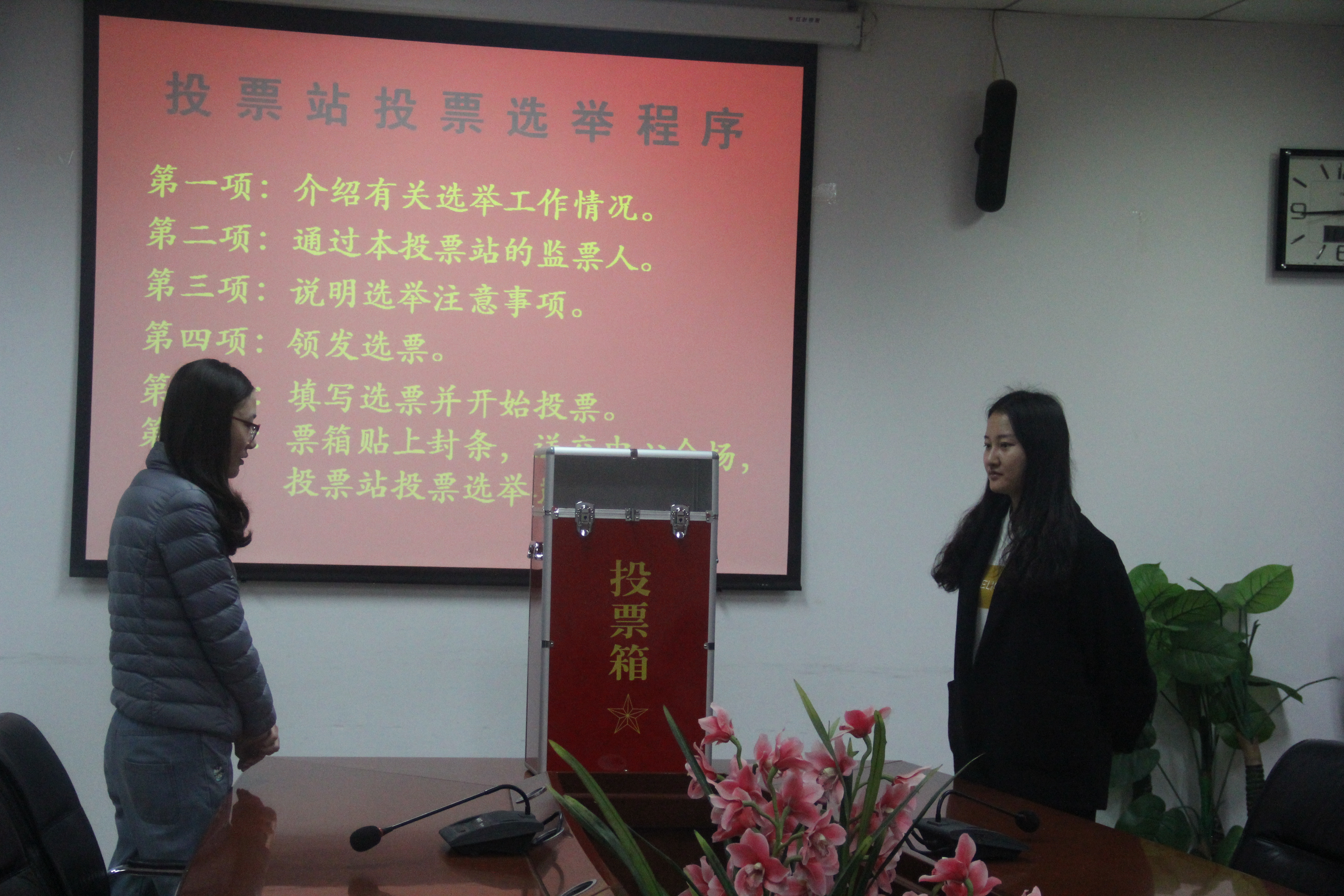 整个投票选举活动按规定有序进行。首先,到场的选民前往313教室领取选票,未到场的选民可委托他人代为投票,每位到场选民可接受最多3名选民委托。委托他人代投的选民需填写委托证,并在委托登记簿上签字。前来投票的选民仔细阅读代表候选人简介,认真填写选票,行使法律赋予的民主权利。在主持人宣读选举流程之后,在监票人的监督下,选民依次前往投票箱投出自己神圣的一票,整个过程严格按照程序进行。