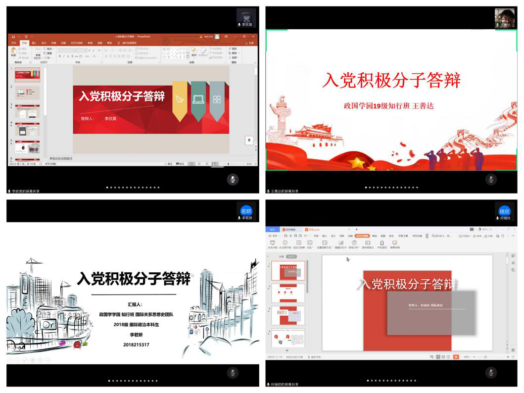 本着从严从难、优中选优的原则,此次会议共历经资格审核、集中答辩、民主测评三个环节。会议伊始,杨远艺同志阐明了入党积极分子的发展要求及会议流程,孙延松老师就答辩工作提出几点要求,测评委员会对4位候选人的入党申请及入党条件予以审核。随后,4位候选人通过PPT共享的方式,从思想认识、入党动机、自我评述、入党规划等方面简要汇报自身情况,表明向党组织靠拢的信心和决心;测评委员会从党的理论知识、2020两会热点等方面对候选人进行考察,进一步了解候选人的综合素质。最后,委员会通过线上匿名投票的方式,对能否推荐4位候选人为入党积极分子分别进行投票表决。