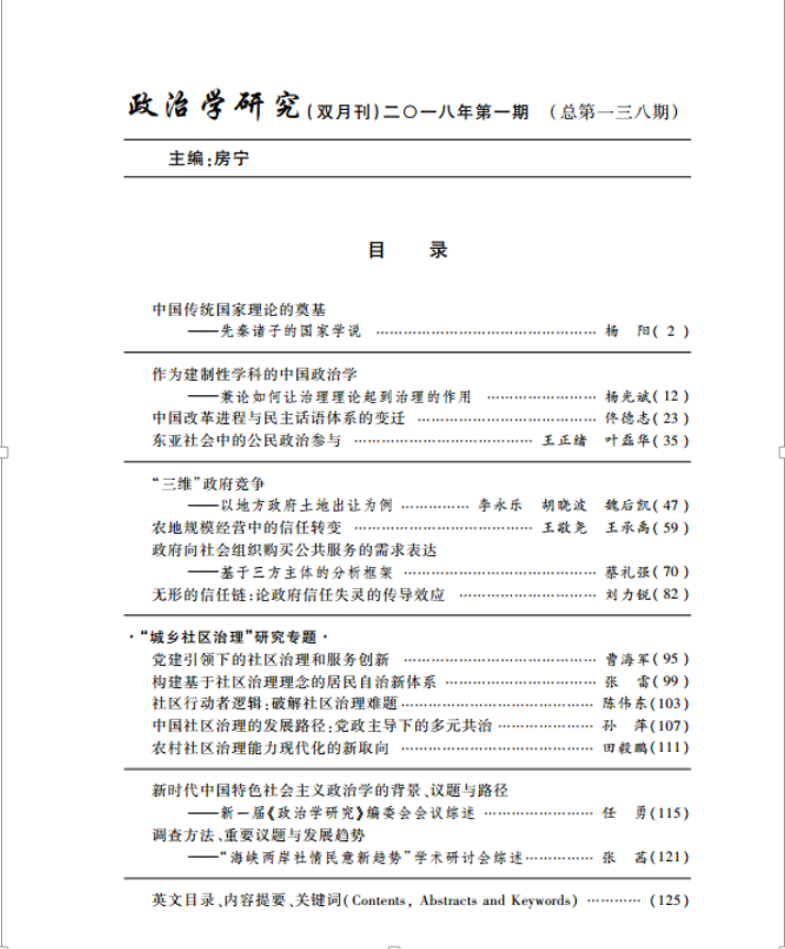 下附:《政治学研究》(双月刊)2018年第1期目录