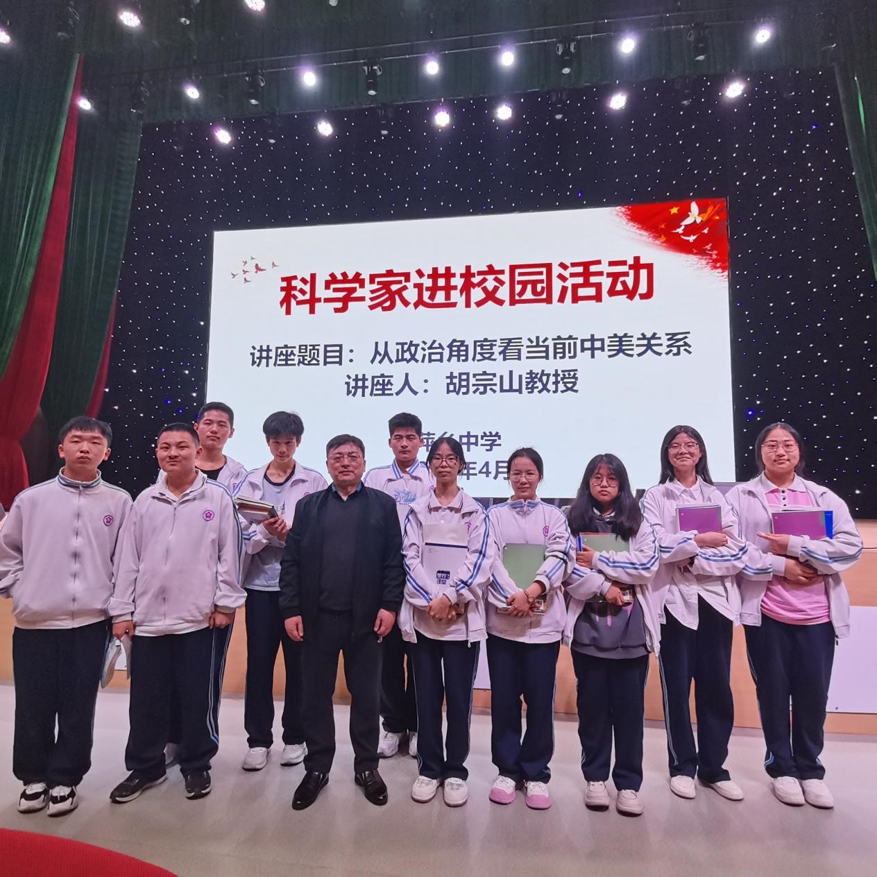 4月10日晚,胡宗山做客萍乡中学“科学家进校园活动”,为萍乡中学教师、学生做了题为《从政治角度看当前中美关系》的时政报告,报告引发师生热烈反响。