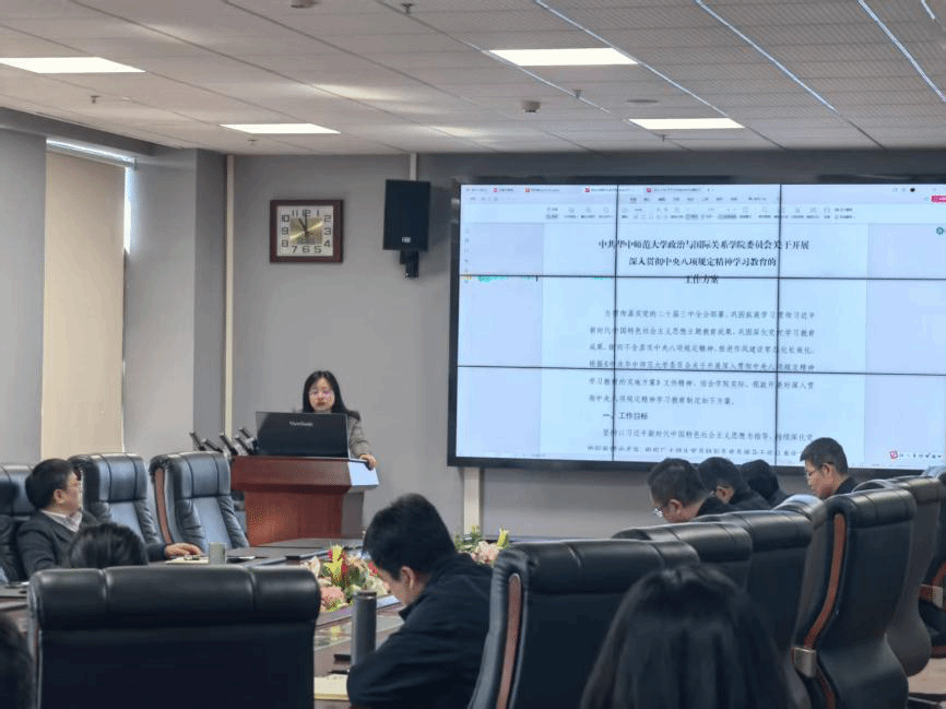 闫丽莉书记传达、领学了《中共华中师范大学委员会关于开展深入贯彻中央八项规定精神学习教育的实施方案》文件精神和学校部署深入贯彻中央八项规定精神学习教育工作会议精神,随后,她向与会人员通报了《中共华中师范大学政治与国际关系学院委员会关于开展深入贯彻中央八项规定精神学习教育的工作方案》,就工作目标、安排及具体要求进行详细解读并征求意见。闫丽莉书记强调,作风建设是一项长期任务,永远在路上,全体师生党员必须时刻保持清醒头脑,严格遵守中央八项规定精神,将相关规定内化于心、外化于行。