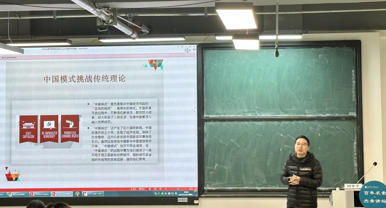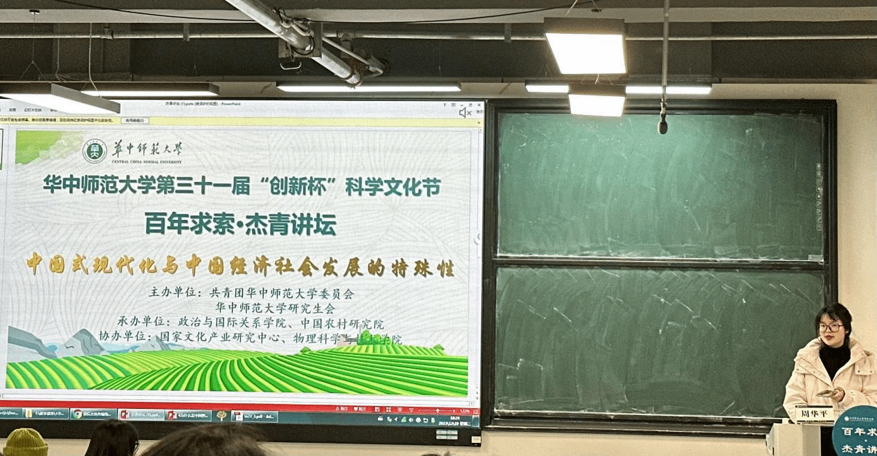 12月19日晚,由华中师范大学研究生会主办,政治与国际关系学院研究生会、中国农村研究院研究生会承办,物理科学与技术学院研究生会、国家文化产业研究中心研究生会协办的第三十一届“创新杯”科学文化节——百年求索·杰青讲坛在八号教学楼8310教室顺利举行。我院周华平副教授带来了题为“中国式现代化与中国经济社会发展的特殊性”的专题讲座,学校100余名研究生聆听了此次讲座。讲座由中国农村研究院研究生会陈思远同学主持。政治与国际关系学院团委书记魏露、团委副书记翁艾迪出席此次活动。