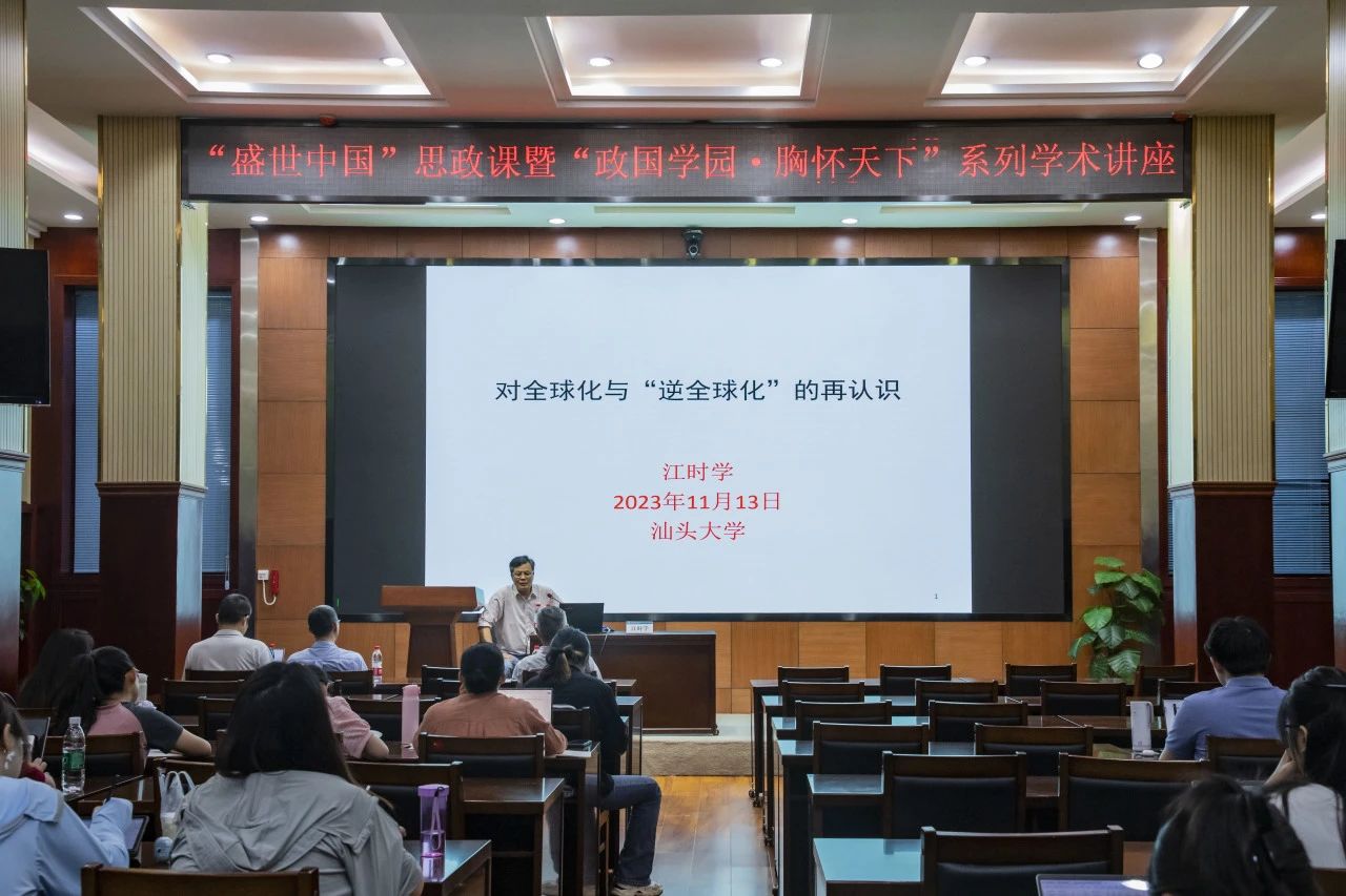 5月18日晚,“盛世中国”思政课暨“政国学园·胸怀天下”系列学术讲座第四讲在文华公书林四楼模拟联合国实验室举行。中国社会科学研究院拉丁美洲研究所原副所长江时学教授作题为“对全球化和‘逆全球化’的认识”的专题讲座。我院国际政治系吴兵教授主持本次讲座。