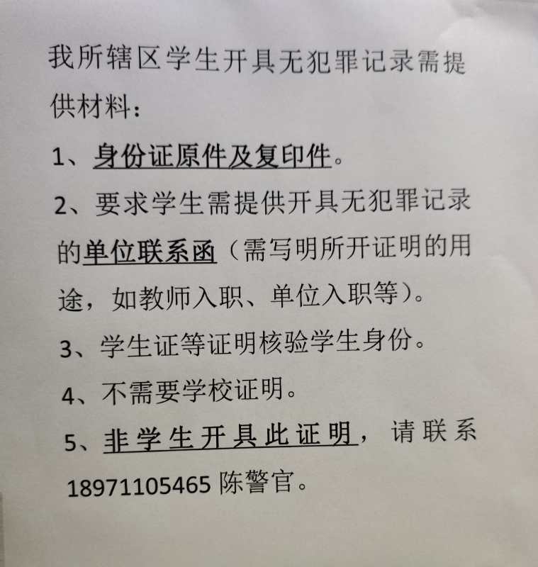学生可凭上述材料直接到洪山公安分局马房山派出所办理“无犯罪记录证明”,联系人:马房山派出所陈警官(手机18971105465)。