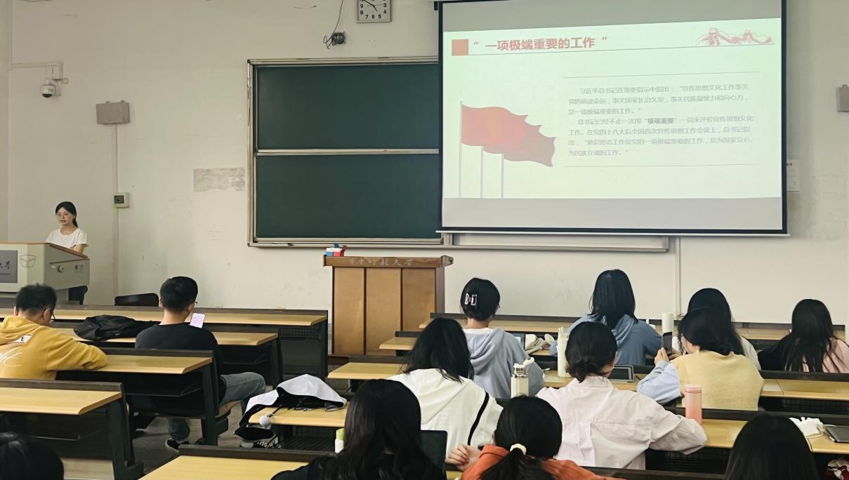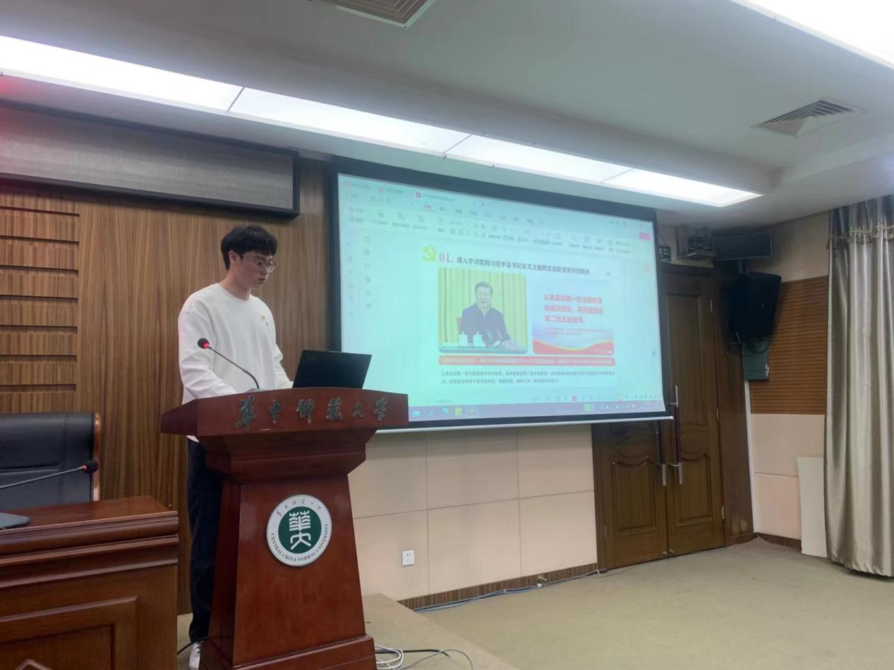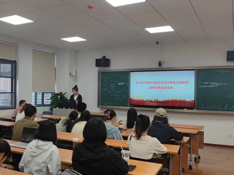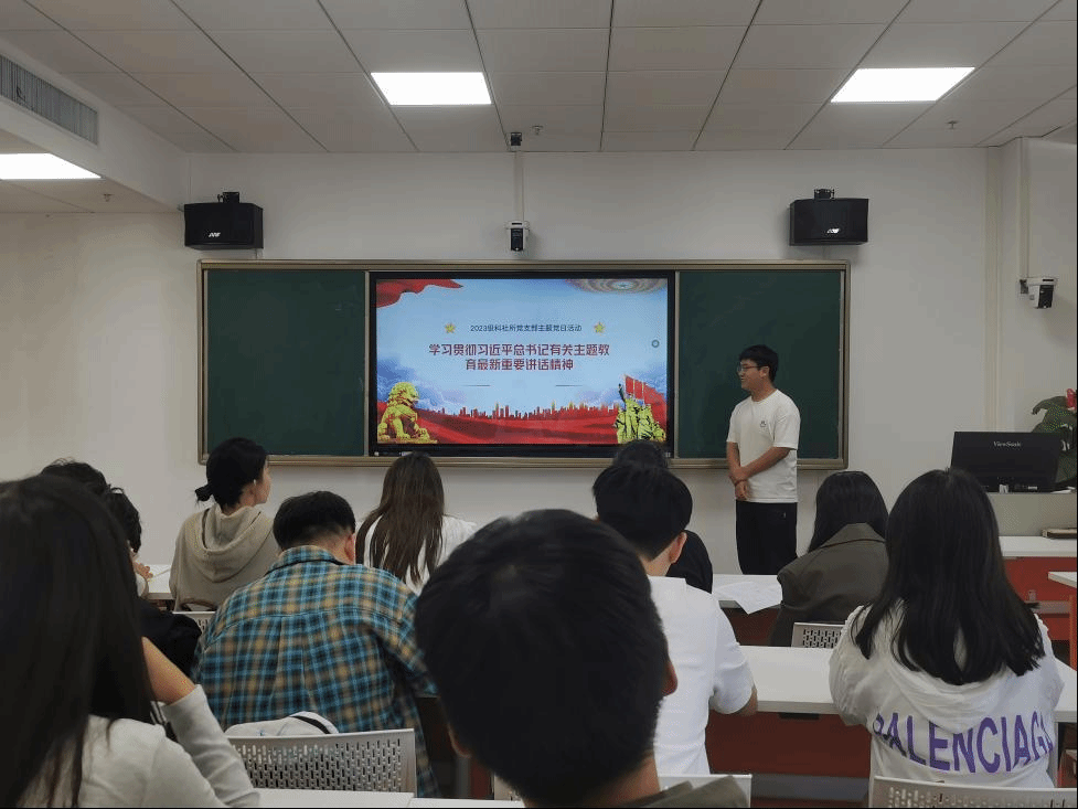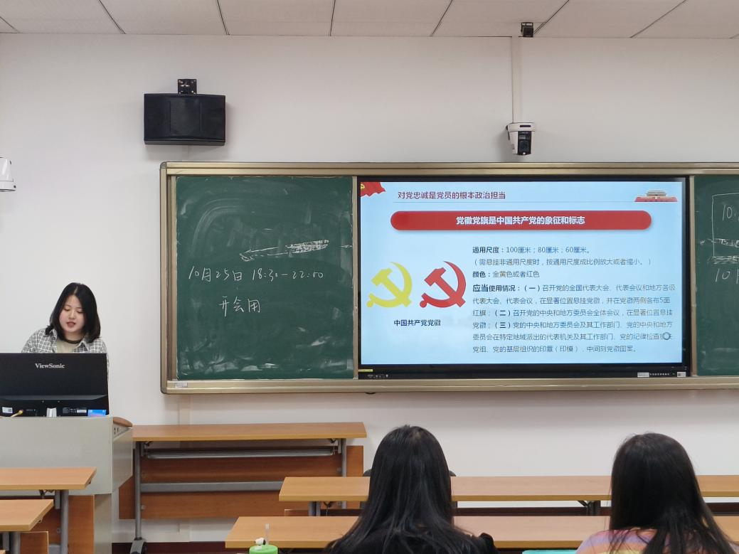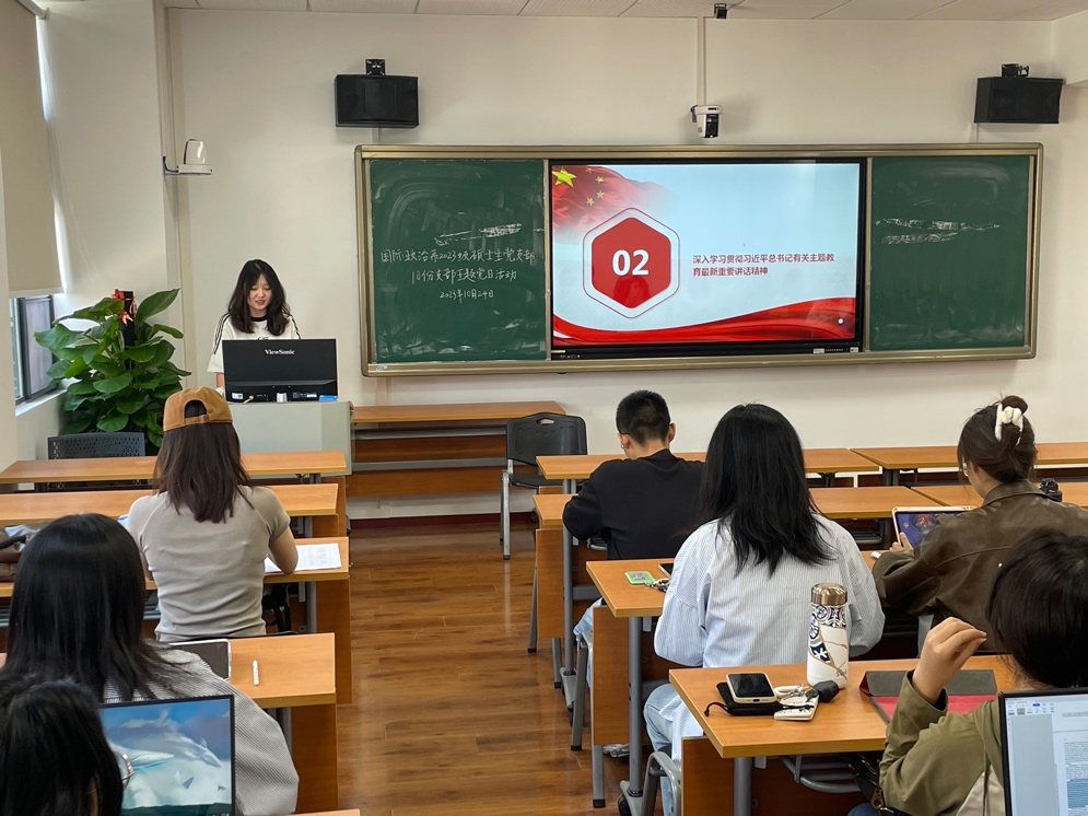 10月25日下午,政治与国际关系学院国际政治系2021级硕士生党支部在文科科研楼802教室开展10月主题党日活动。本次会议由党支部书记胡洋洋组织,支部第三学习小组成员郭宾同志主持。会议开始,全体起立唱国歌,由党支部书记胡洋洋同志领誓重温入党誓词。本次主题党日活动共分为三个理论学习部分:深入学习贯彻习近平总书记有关主题教育最新重要讲话精神;学习贯彻习近平总书记重要指示和全国宣传思想文化工作会议精神;贯彻落实《中国共产党党徽党旗条例》。
