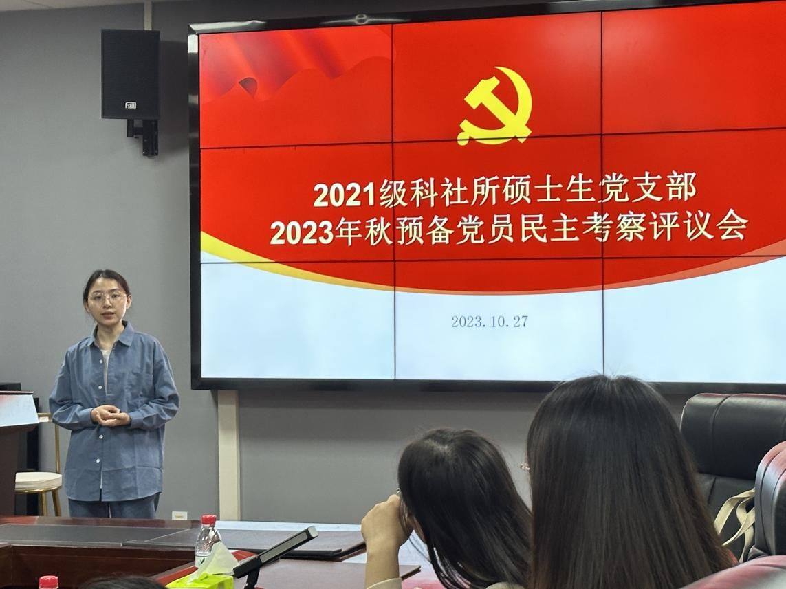 10月27日晚上,政治与国际关系学院科社所2021级硕士生党支部于文科科研楼1005会议室召开十月党日活动暨2023年秋预备党员民主考察评议会。本次活动由党支部书记徐丝斯主持,支部党员、入党积极分子参与。