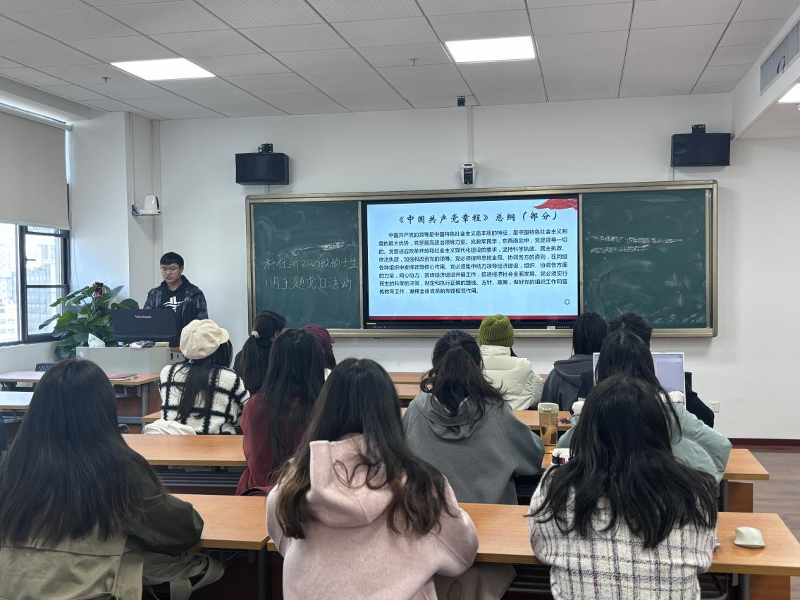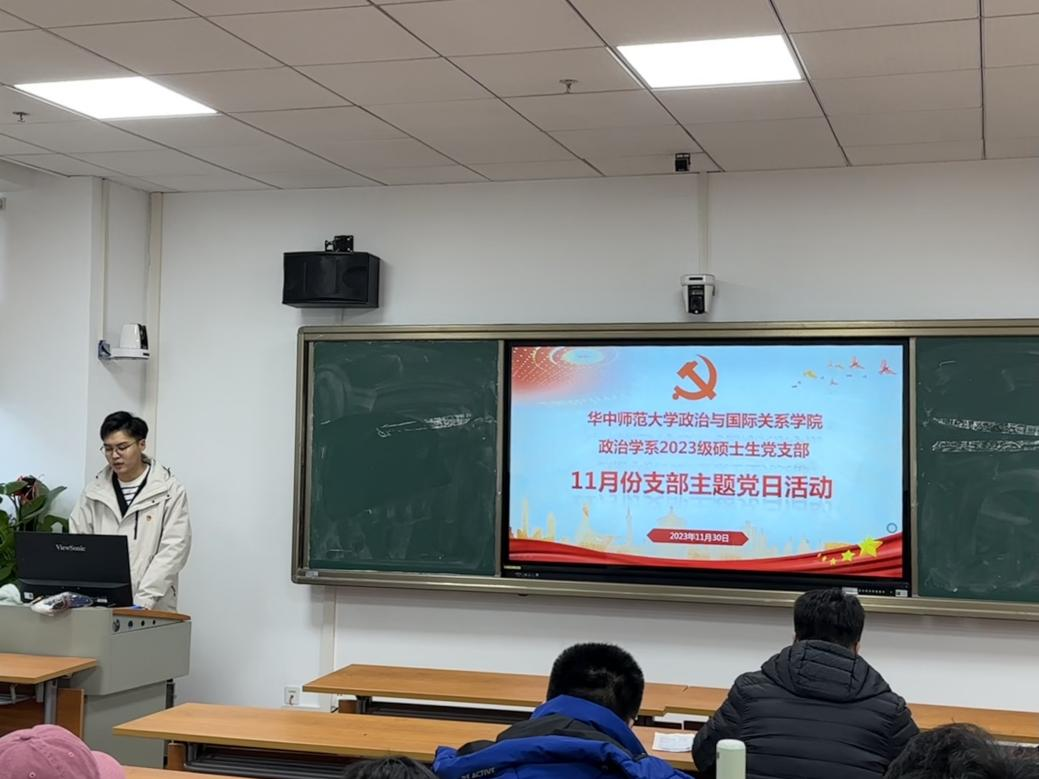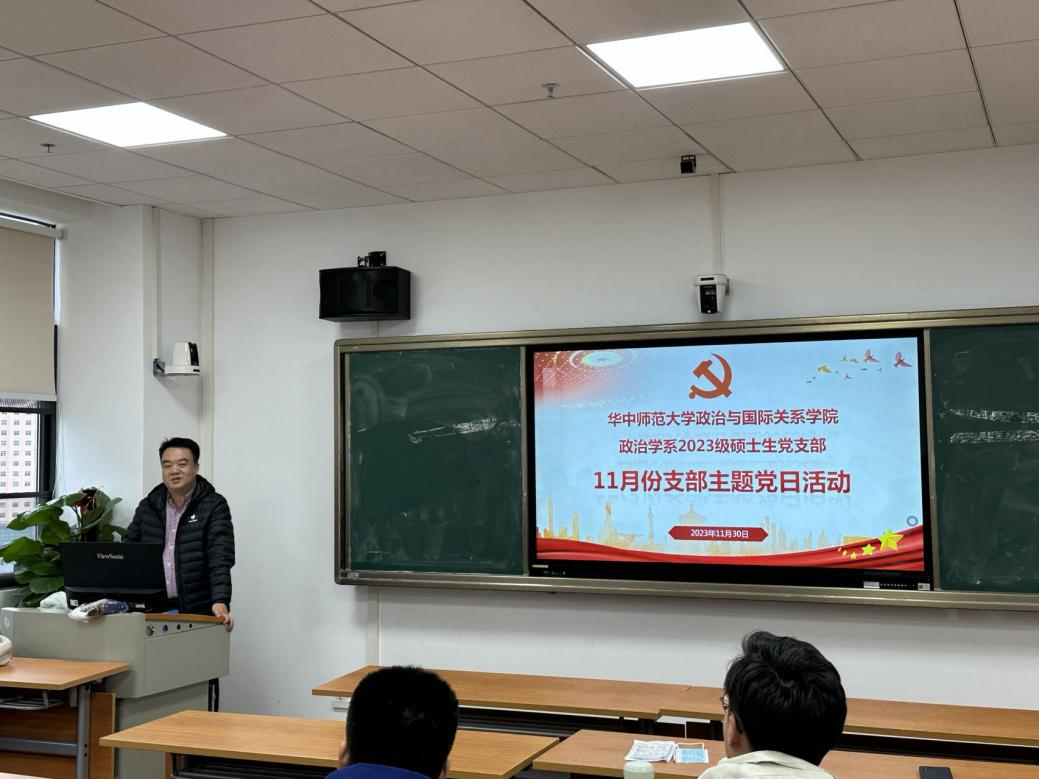 11月30日,政治与国际关系学院政治学系2023级硕士生党支部于文科科研楼802教室举行11月主题党日活动。本次活动由支部书记李瑞浩同志主持,支部全体成员参加,学院副院长黄辉祥老师出席活动。
