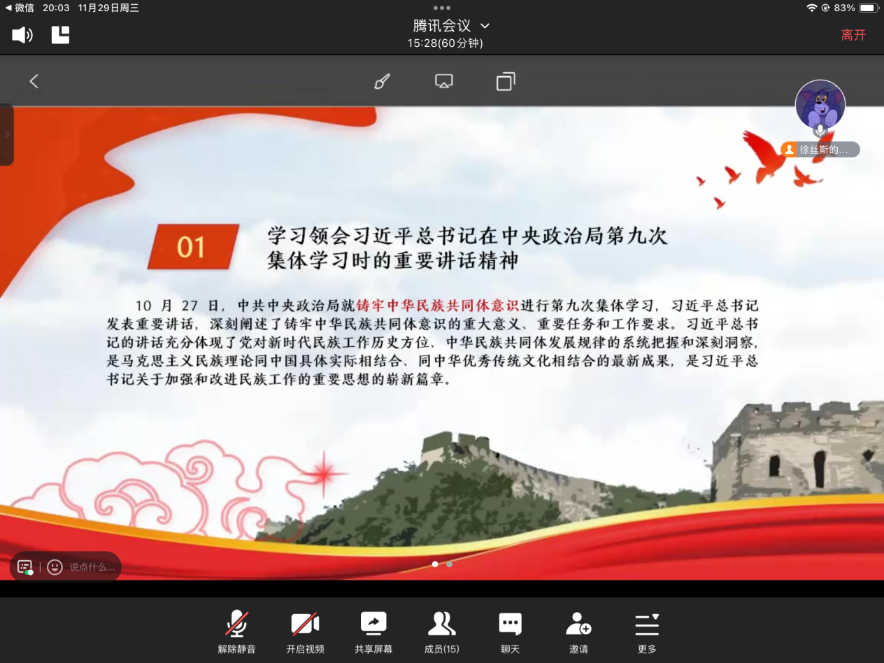 11月29日,政治与国际关系学院科社所2021级硕士生党支部于腾讯会议开展11月主题党日活动暨接受预备党员大会。本次活动由党支部书记徐丝斯主持,党支部全体党员和预备党员参与学习。