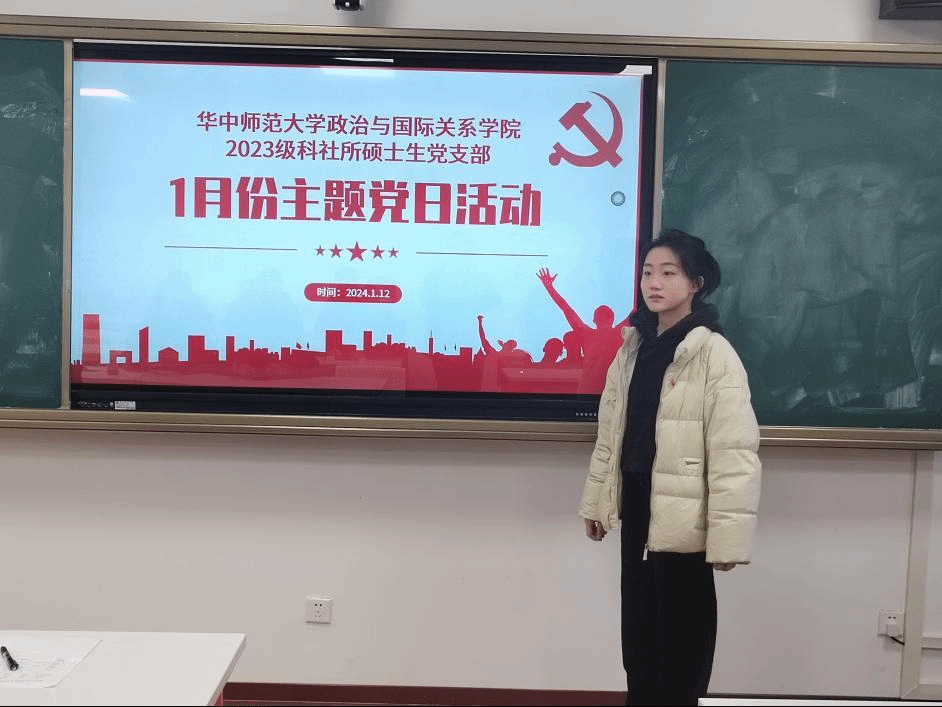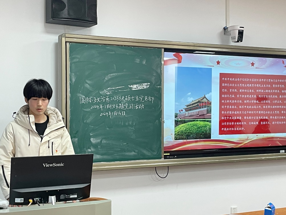 1月16日,政治与国际关系学院国际政治系2023级硕士生党支部于文科科研楼802教室举行1月主题党日活动。本次主题党日活动由国际政治系2023级硕士生党支部书记蒲文杰主持,参会人员为党支部全体成员。