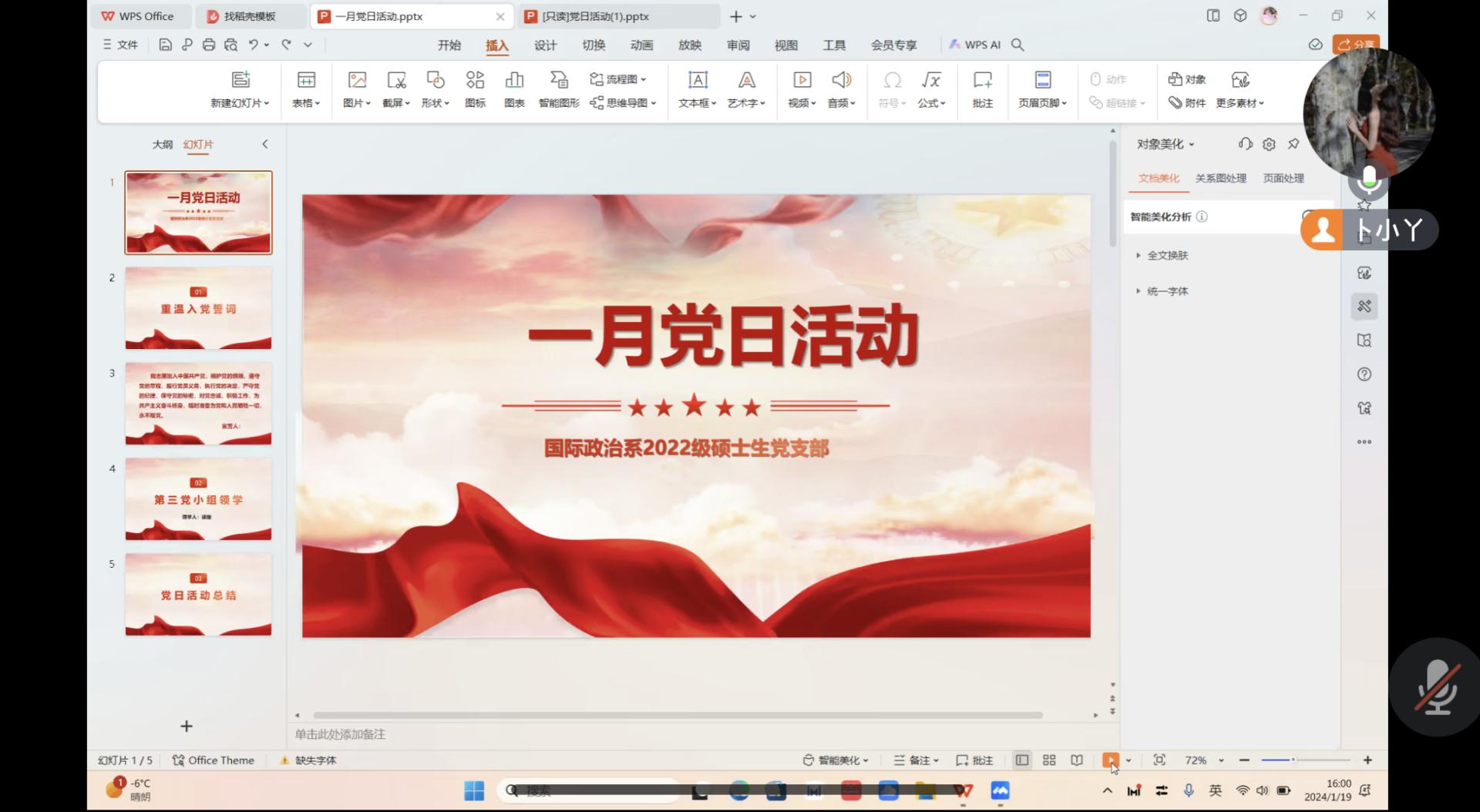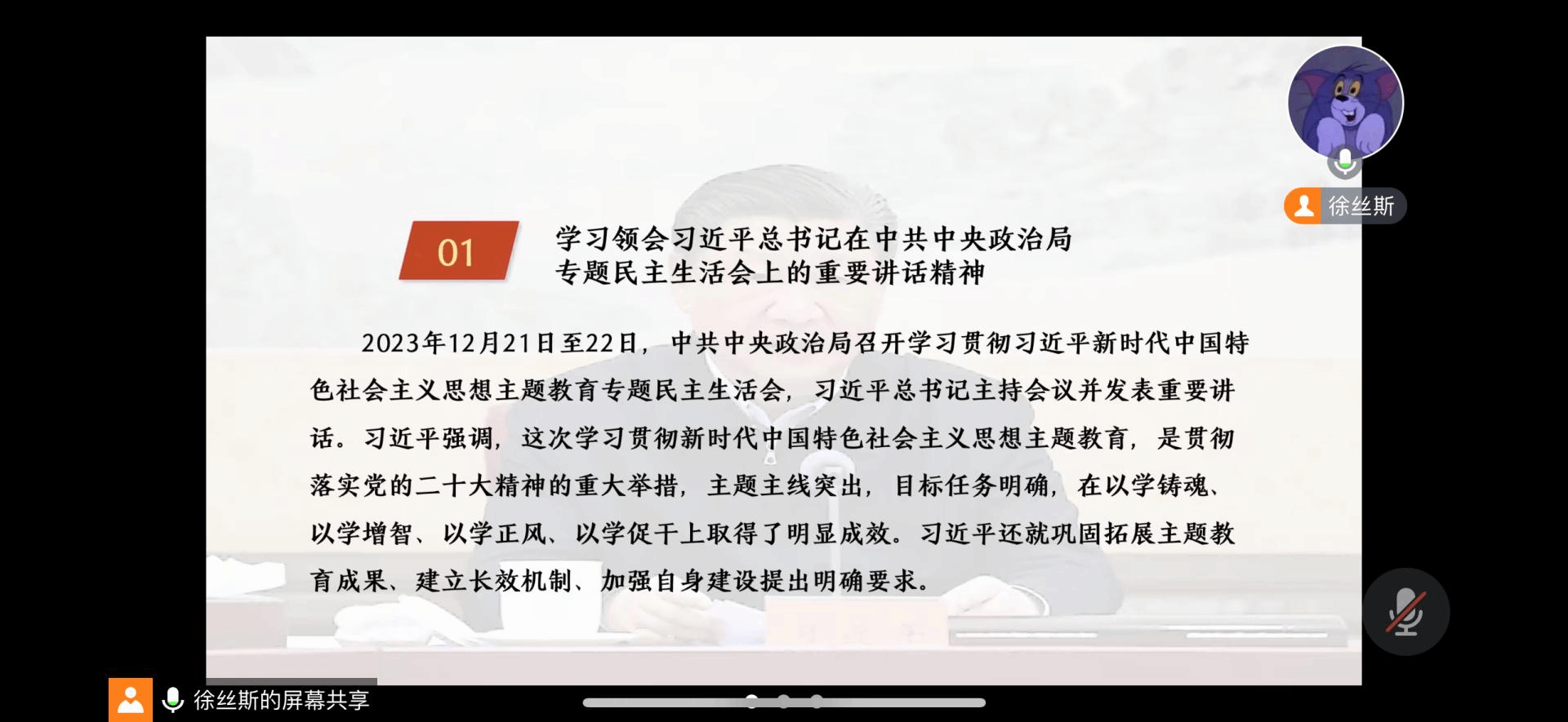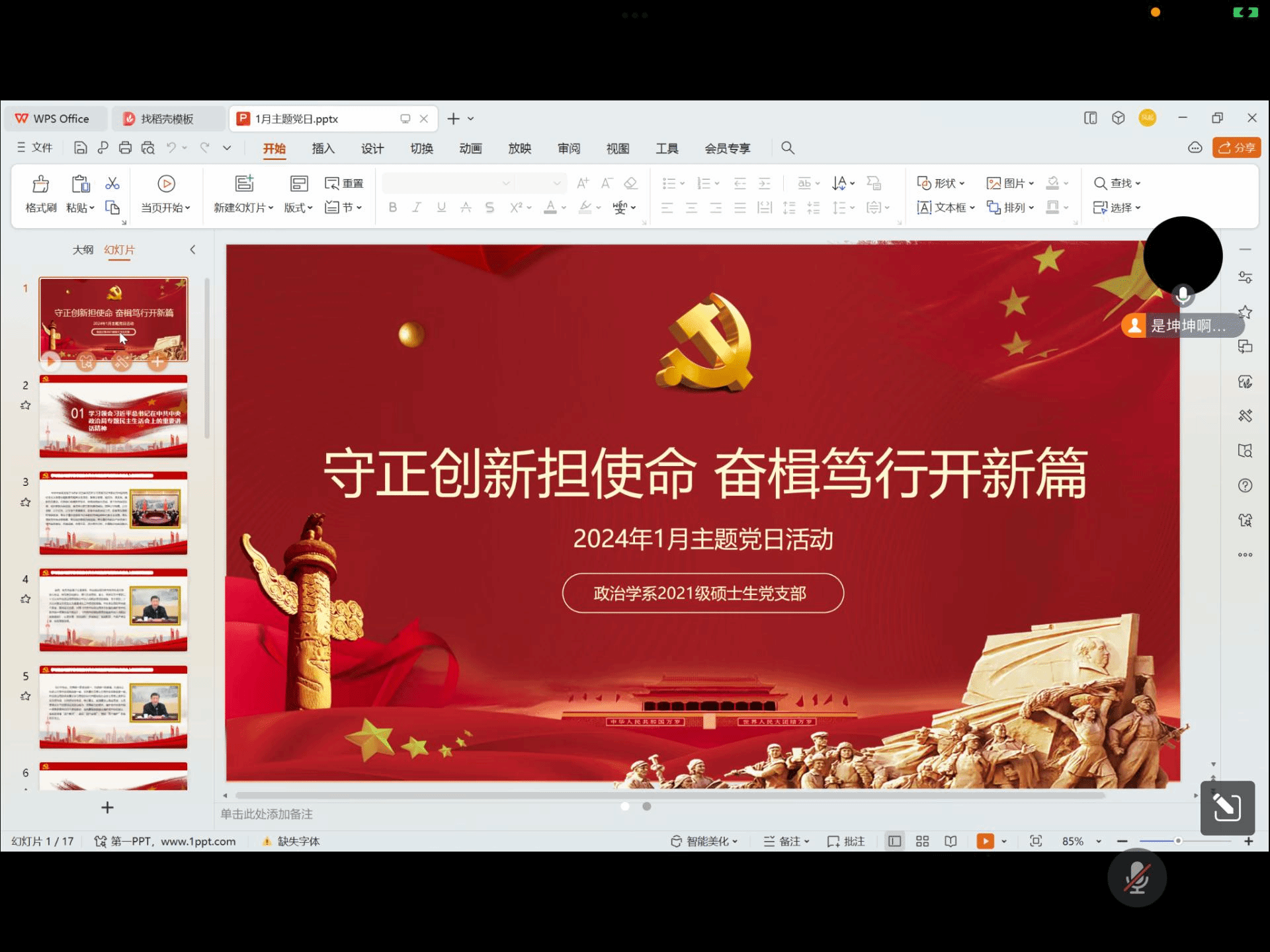 1月17日,国际政治系2021级硕士生党支部于腾讯会议开展1月主题党日活动。本次主题党日活动由第三学习小组成员负责,胡洋洋同志主持,参会人员为政治与国际关系学院国际政治系2021级硕士生党支部全体党员及全体入党积极分子。