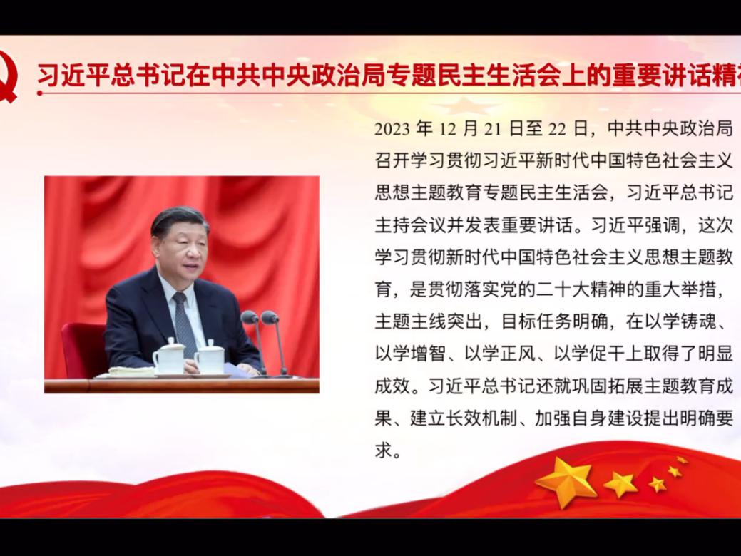 活动第一项,学习领会习近平总书记在中共中央政治局专题民主生活会上的重要讲话精神。活动第二项,学习贯彻习近平总书记在纪念毛泽东同志诞辰130周年座谈会上的重要讲话精神。徐丝斯同志带领大家学习了习近平总书记在座谈会上提出的“六个要求”。活动第三项,传达学习中央外事工作会议精神。徐丝斯同志介绍了新时代中国特色大国外交的“十项成就”以及“六个必须”宝贵经验。活动第四项,认真学习《中国共产党纪律处分条例》。