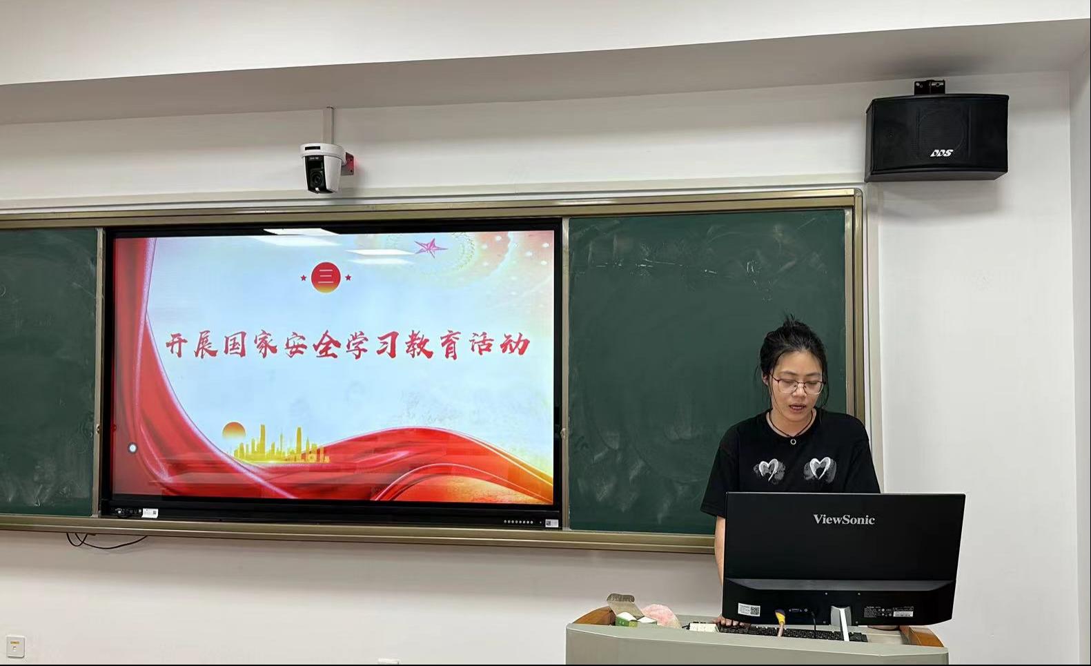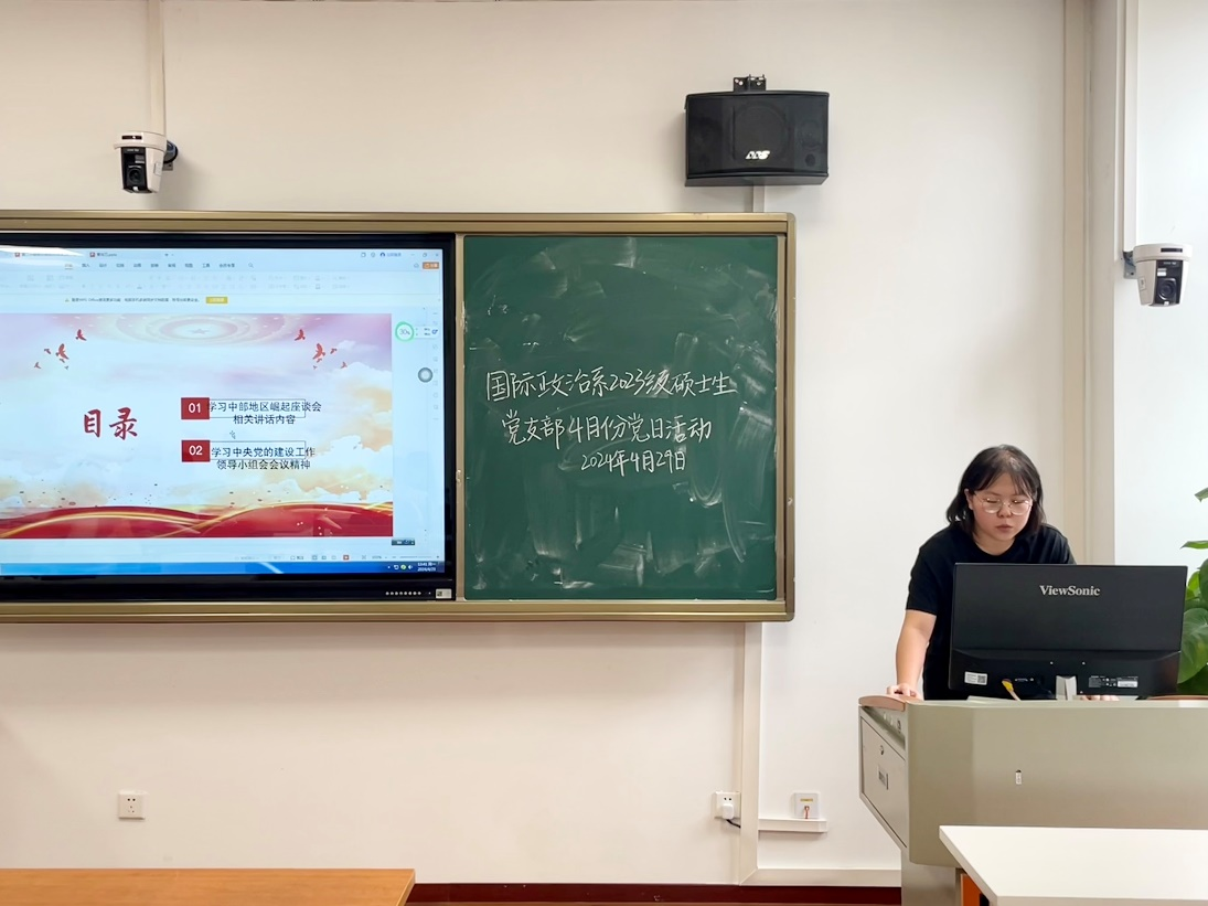 4月29日,国际政治系2022级硕士生党支部于文科科研楼801教室开展以“坚持总体国家安全观,坚守国家安全底线”为主题的4月主题党日活动,活动由支部书记卜小丫同志主持,党支部全体成员出席,纪检委员朱曼烨进行考勤记录。