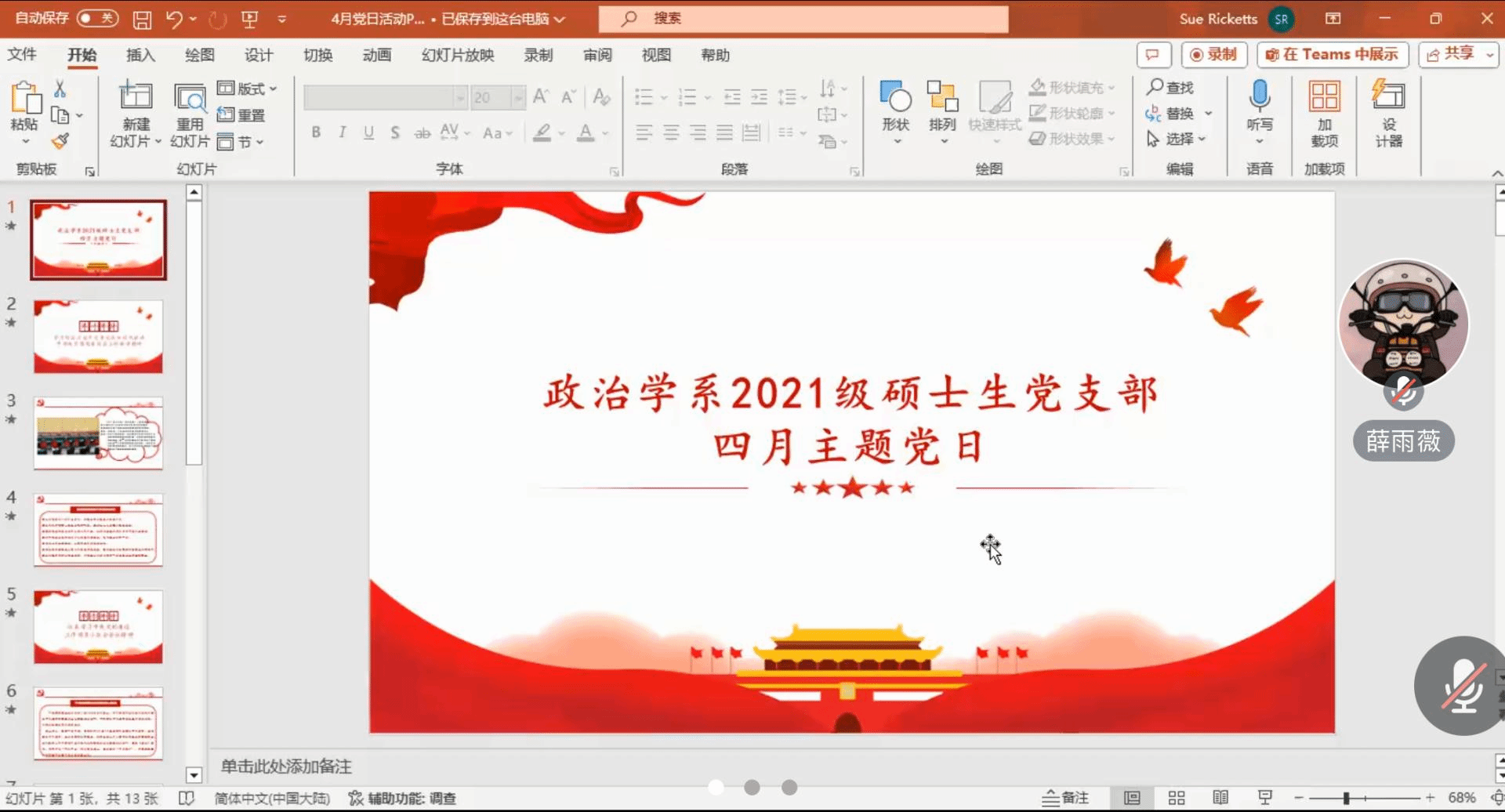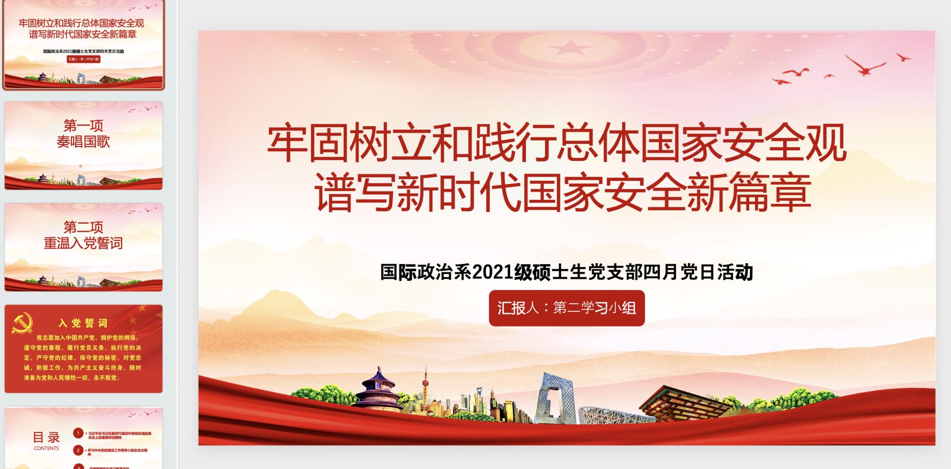 4月29日下午,国际政治系2021级硕士生党支部于腾讯会议线上开展以“牢固树立和践行总体国家安全观,谱写新时代国家安全新篇章”为主题的4月主题党日活动。本次主题党日活动由第二小组成员负责,王栋梁同志主持,参会人员为国际政治系研究生第一党支部全体党员及全体入党积极分子。