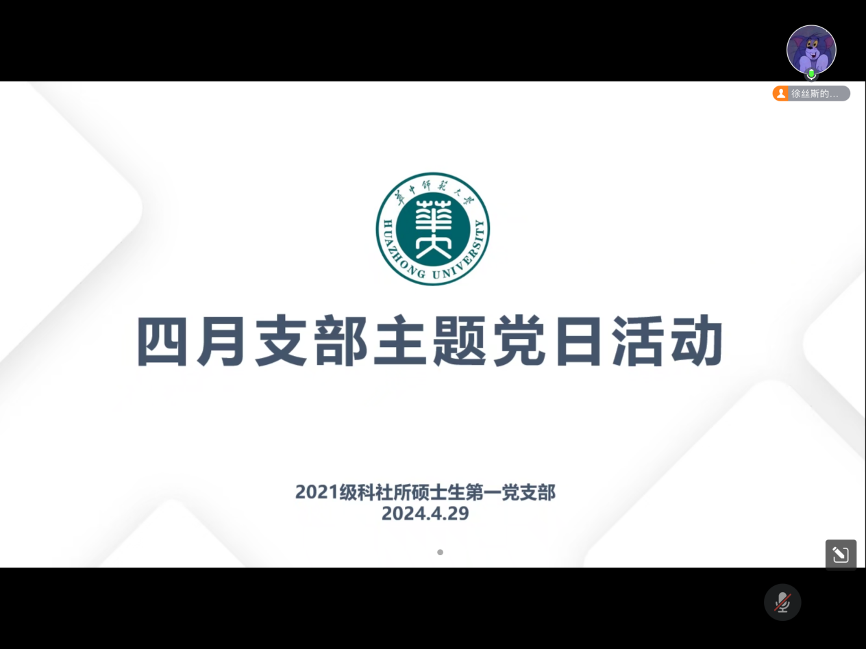 4月29日,我院科社所2021级硕士生党支部于腾讯会议开展4月主题党日活动。本次党日活动由支部书记徐丝斯同志主持,支部全体党员共同参与。