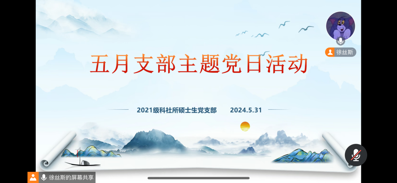 5月31日,我院科社所2021级硕士生党支部于腾讯会议开展5月主题党日活动。本次党日活动由支部书记徐丝斯同志主持,支部全体党员共同参与。