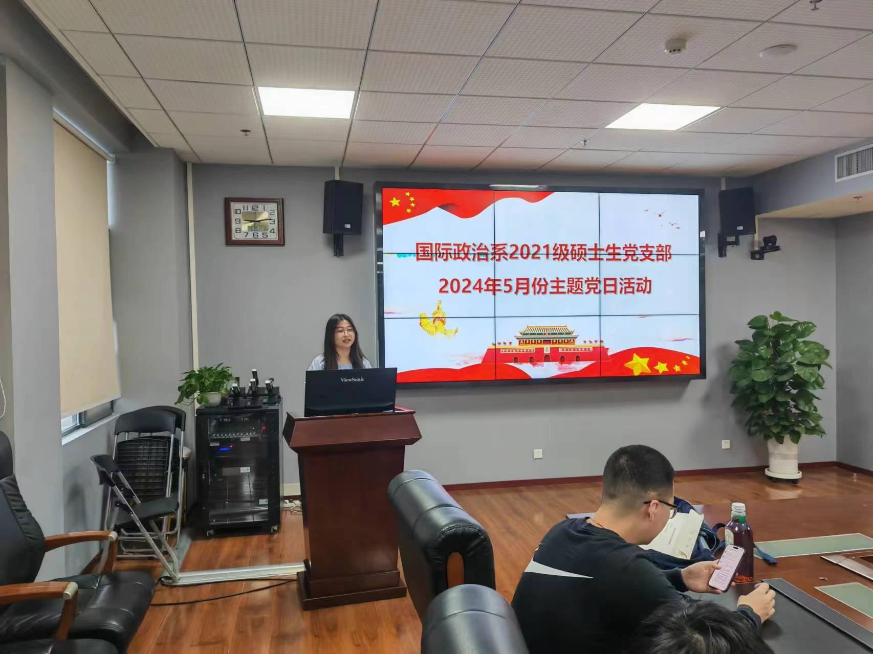 5月30日下午,我院国际政治系2021级硕士生党支部于文科科研楼南楼1005会议室开展5月主题党日活动。本次主题党日活动由支部书记胡洋洋同志主持,参会人员为支部全体党员及发展对象。
