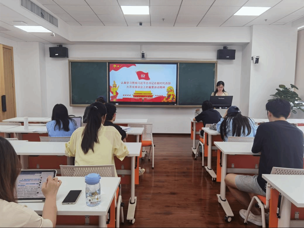 党日活动伊始,全体党员重温入党誓词。随后,杨晶晶同志带领同学们学习了党纪学习教育的相关情况。习近平总书记指出,推进中国式现代化,必须坚持党的领导、抓好党的建设。杨晶晶同志介绍到,正在全党开展的党纪学习教育是今年党建工作的重点任务,各级党组织要精心组织、扎实推动、务求实效。接着程海清同志带领大家学习了习近平总书记在新时代西部大开发座谈会上的重要讲话精神。西部地区在全国改革发展稳定大局中举足轻重。要一以贯之抓好党中央推动西部大开发政策举措的贯彻落实,进一步形成大保护、大开放、高质量发展新格局,提升区域整体实力和可持续发展能力,在中国式现代化建设中奋力谱写西部大开发新篇章。最后,李天洁同志带领大家学习了习近平总书记对学校思政课建设做出的重要指示。总书记指出,党的十八大以来,党中央始终坚持把学校思政课建设放在教育工作的重要位置,党对思政课建设的领导全面加强,各级各类学校社会主义办学方向更加鲜明,思政课教师乐教善教、潜心育人的信心底气更足,广大青少年学生“四个自信”明显增强、精神面貌奋发昂扬,思政课发展环境和整体生态发生全局性、根本性转变。