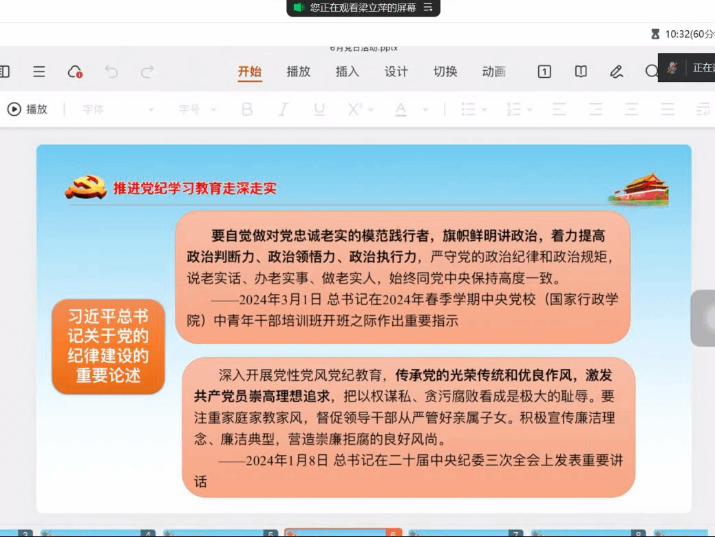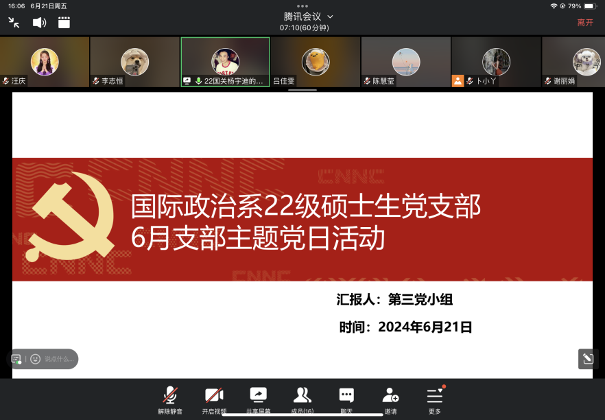 6月21日,我院国际政治系2022级硕士生党支部于线上腾讯会议开展以“勤俭自律铸党魂,推动高质量发展”为主题的6月主题党日活动,活动由支部书记卜小丫同志主持,党支部全体成员出席,纪检委员朱曼烨进行考勤记录。
