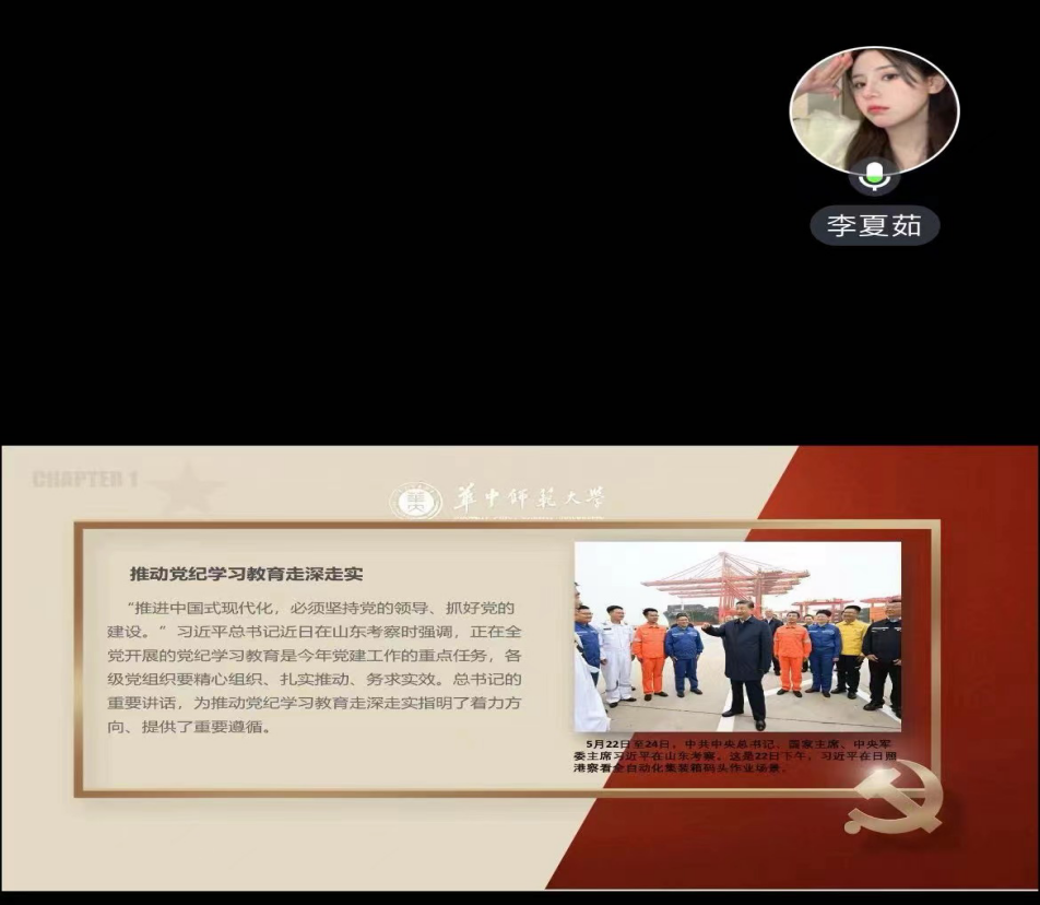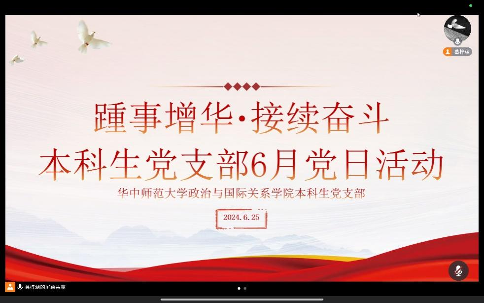 6月25日,我院本科生党支部于线上腾讯会议举行6月主题党日活动。本次活动由葛梓涵同志主持,陈姝婉同志、邱丽同志、向欣慧同志领学,支部全体党员参与。