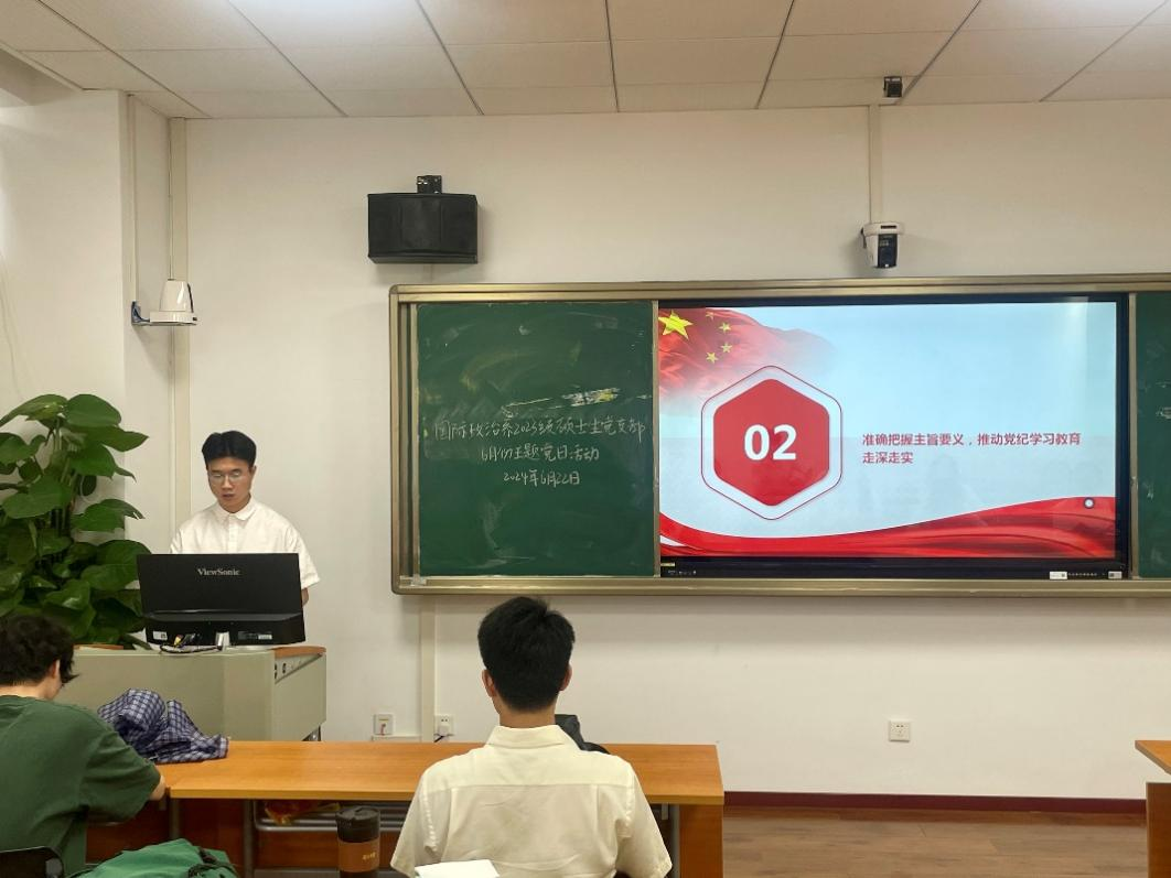 会议第一项,全体党员共唱国歌,博士生第二党支部组织委员黄胜胜同志带领大家重温入党誓词,学习《中国共产党章程》第六章。会议第二项,博士生第二党支部书记龚倬带领全体党员同志开展党日主题学习活动。主要内容包括继续开展党纪学习教育,龚倬以“以党纪为标尺,从严从实检身正己”为题讲授党的纪律学习教育专题党课;学习《中国共产党纪律处分条例》;学习贯彻习近平总书记在中共中央政治局第十四次集体学习时的重要讲话精神;学习习近平总书记重要文章《开创我国高质量发展新局面》等内容。