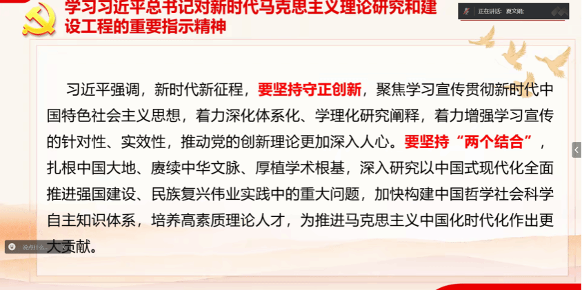 中共中央总书记、国家主席、中央军委主席习近平近日对新时代马克思主义理论研究和建设工程作出重要指示,他指出马克思主义理论研究和建设工程是党的思想理论建设的基础工程、战略工程。夏文娟同志介绍到,学习习近平总书记对新时代马克思主义理论研究和建设工程的重要指示精神就是要把学习研究宣传习近平新时代中国特色社会主义思想作为根本任务,不断加强对“两个结合”的研究和把握、坚持以党的创新理论为引领、形成统筹有力、管理科学、激励创新的工作格局。