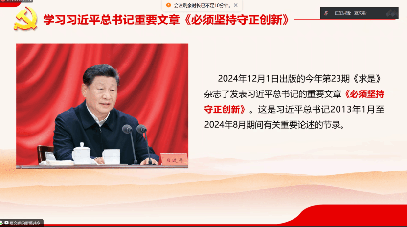 此后夏文娟同志带领大家学习了习近平总书记的重要文章《必须坚持守正创新》。文章指出要坚持守正和创新相统一,坚守党的性质宗旨、理想信念、初心使命不动摇,同时要以新的理念、思路、办法、手段解决好党内存在的各种矛盾和问题,不断提高自我革命实效。党员同志必须坚持马克思主义的发展观点,坚持实践是检验真理的唯一标准,发挥历史的主动性和创造性,锐意进取,不断创新。
