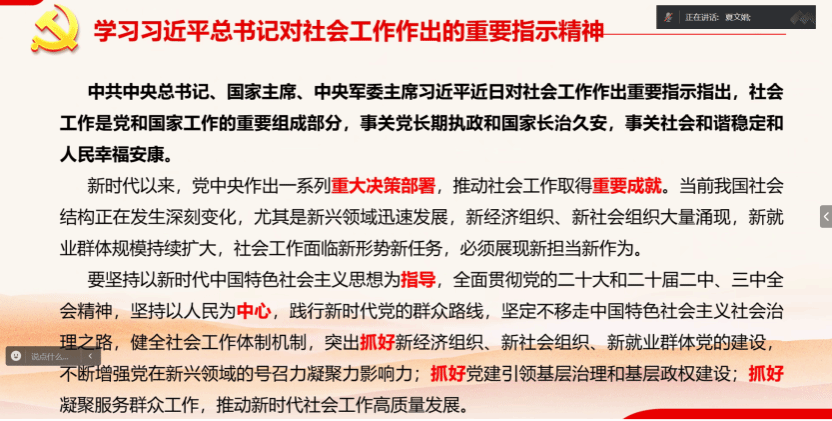 接下来,魏心阅同志领学了习近平总书记对社会工作作出的重要指示精神,强调了做好社会工作的重要性。社会工作是党和国家工作的重要组成部分,事关党长期执政和国家长治久安,事关社会和谐稳定和人民幸福安康,要坚持以新时代中国特色社会主义思想为指导,全面贯彻党的二十大和二十届二中、三中全会精神,坚持以人民为中心,践行新时代党的群众路线,坚定不移走中国特色社会主义社会治理之路,健全社会工作体制机制,突出抓好新经济组织、新社会组织、新就业群体党的建设,不断增强党在新兴领域的号召力凝聚力影响力;抓好党建引领基层治理和基层政权建设;抓好凝聚服务群众工作,推动新时代社会工作高质量发展。