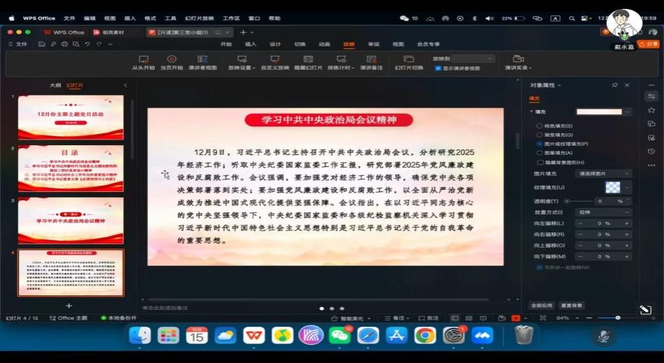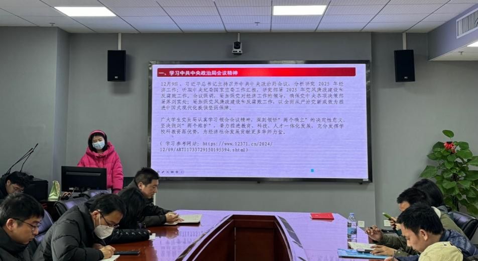 第一部分,夏文娟同志带领大家学习了中共中央政治局会议精神。12 月 9 日,习近平总书记主持召开中共中央政治局会议,会议分析研究了2025年经济工作并研究部署了2025年党风廉政建设和反腐败工作。学习过后全体党员表示要把学习贯彻中共中央政治局会议精神,与加强革新自身观念、系统提升自身素质结合起来,以习近平新时代中国特色社会主义思想为指导,深刻领悟“两个确立”的决定性意义,坚决做到“两个维护”。