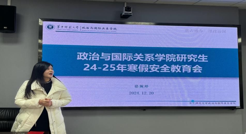 随后,院党务干事、研究生辅导员骆婉婷对政治与国际关系学院博士研究生开展2024年至2025年寒假安全教育会。骆婉婷老师进行反诈防骗安全学习教育,观看相关纪录片;着重强调加强人身安全防范,不无证驾驶机动车,不酒后驾驶机动车,不驾驶无牌无证机动车。此外,骆婉婷老师鼓励在座的各位博士研究生活出自己,每个人都有自己的形状,每一段路都不会白走。