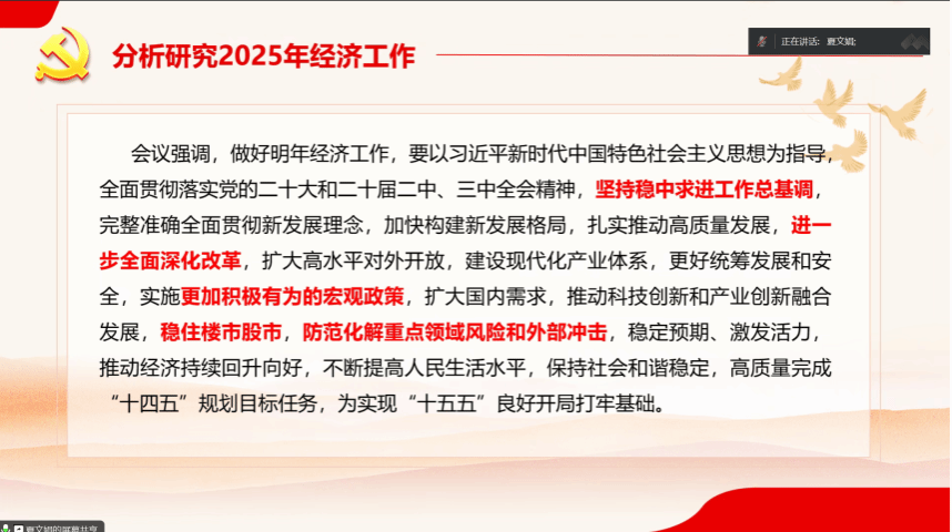 魏心阅同志首先介绍了中共中央政治局会议精神。他提到,2024年12月9日,习近平总书记主持召开了中共中央政治局会议,在会议中主要完成了以下三项重要内容:分析研究2025年经济工作;听取中央纪委国家监委工作汇报,研究部署2025年党风廉政建设和反腐败工作。会议认为,今年是实现“十四五”规划目标任务的关键一年,以习近平同志为核心的党中央团结带领全党全国各族人民,沉着应变、综合施策,经济运行总体平稳、稳中有进,我国经济实力、科技实力、综合国力持续增强。