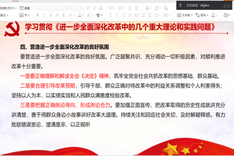 通过对习近平总书记重要文章《进一步全面深化改革中的几个重大理论和实践问题》的学习,党员们回顾了新时代全面深化改革的重大成果。同时,深刻理解了守正创新在改革中的关键作用,明确改革要坚持正确方向和原则,全面协调推进。