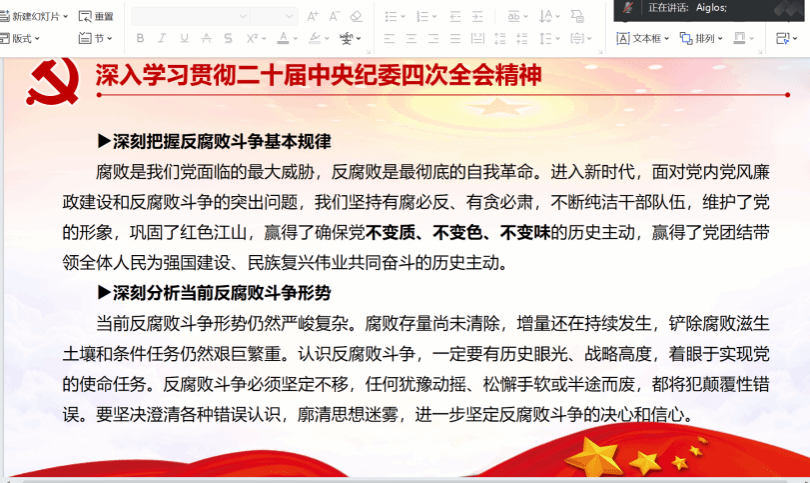 胡玉娜同志首先介绍了习近平总书记在二十届中央纪委四次全会上的重要讲话和全会精神。她提到,2025年1月6日,二十届中央纪委四次全会在北京召开,习近平总书记发表重要讲话:充分肯定过去一年全面从严治党新进展新成效,对坚决打好反腐败斗争攻坚战、持久战、总体战提出明确要求,对深入推进全面从严治党作出战略部署。胡玉娜同志总结了习近平总书记重要讲话的三大要点:风腐同查同治是对党风廉政建设和反腐败斗争规律性认识的深化,要准确把握风腐一体、风腐交织的阶段性特征,坚持正风肃纪反腐相贯通,树立全局思维、增强系统观念,不断健全不正之风和腐败问题同查同治机制。同时,还对党员同志提出了新要求——党员同志应当深入学习贯彻习近平总书记重要讲话和全会精神,同时,与深入学习贯彻党的二十大和党的二十届三中全会精神紧密结合起来,并贯彻到实践中。