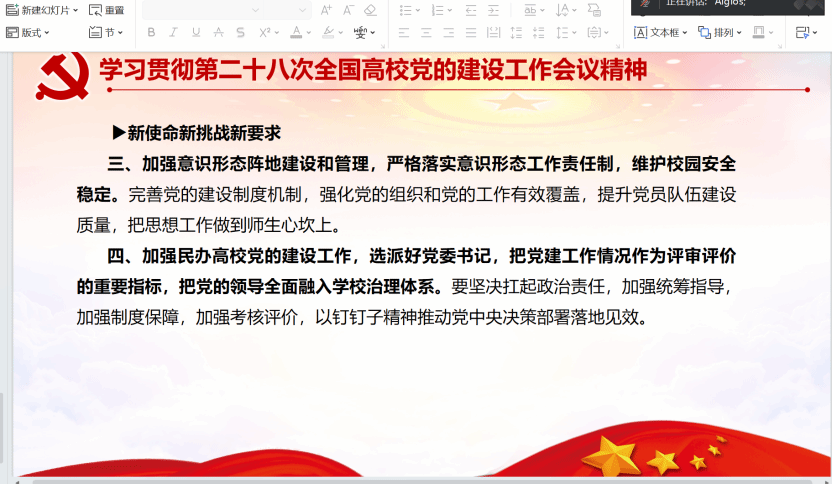 第四部分是学习贯彻第二十八次全国高校党的建设工作会议精神。习近平总书记站在党和国家事业发展全局的战略高度,对高校党建工作提出一系列新思想新论断新要求,为推进高校党的建设提供了根本遵循。总书记指出加强党对高校的领导,加强和改进高校党的建设,是办好中国特色社会主义大学的根本保证。其中坚持党委领导下的校长负责制,是高校领导体制长期探索的历史选择。而思想政治工作是学校各项工作的生命线,高校思想政治工作是党领导高校工作的具体体现,更是开展高校党的建设的重要抓手。