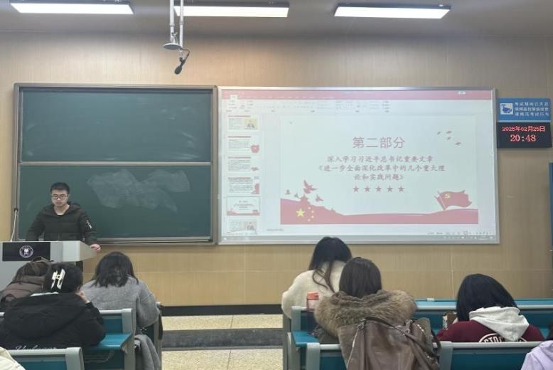 会上,博士生第一党支部书记洪子琳带领全体党员同志开展党日主题学习活动。主要包括深入学习领会习近平总书记在二十届中央纪委四次全会上的重要讲话和全会精神;深入学习贯彻《教育强国建设规划纲要(2024—2035年)》;深入学习习近平总书记重要文章《进一步全面深化改革中的几个重大理论和实践问题》;深入学习贯彻第二十八次全国高校党的建设工作会议精神。