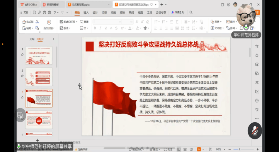 由孙钰婷同志带领全体同志学习打好反腐败斗争攻坚战持久战总体战。国家主席、中央军委主席习近平在中国共产党第二十届中央纪律检查委员会第四次全体会议上强调新时代以来推进全面从严治党和反腐败斗争力度之大前所未有,成效有目共睹。要始终保持反腐败永远在路上的坚韧执着,保持战略定力和高压态势,一步不停歇、半步不退让,一体推进不敢腐、不能腐、不想腐,坚决打好这场攻坚战、持久战、总体战。腐败是我们党面临的最大威胁,而反腐败是最彻底的自我革命。认识反腐败斗争,一定要有历史眼光、战略高度,着眼于实现党的使命任务。反腐败斗争必须坚定不移,任何犹豫动摇、松懈手软或半途而废,都将犯颠覆性错误。我们需要推进政治监督具体化、精准化、常态化;同时引导党员、干部把他律转化为自律,内化为日用而不觉的言行准则;深入推进风腐同查同治;要强化全面从严治党主体责任和监督责任并持续推动全面从严治党向基层延伸。