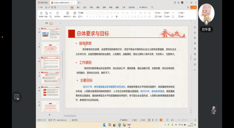 由刘华星同志带领大家学习贯彻《教育强国建设规划纲要(2024—2035年)》。纲要的指导思想是坚持教育优先发展,全面贯彻党的教育方针,坚定不移走中国特色社会主义教育发展道路,坚持社会主义办学方向,全面把握教育的政治属性、人民属性、战略属性,落实立德树人根本任务,为党育人、为国育才。工作原则是坚持党对教育事业的全面领导,突出促进公平、提高质量,强化战略引领、支撑发展,深化改革创新、协同融合,坚持自主自信、胸怀天下。到2027年,教育强国建设取得重要阶段性成效。各级教育普及水平持续巩固提升,高质量教育体系初步形成,人民群众教育获得感明显提升,人才自主培养质量全面提高。主要目标是期望到2035年时,建成教育强国。高质量教育体系全面建成,基础教育普及水平和质量稳居世界前列,学习型社会全面形成,人民群众教育满意度显著跃升,教育现代化总体实现。