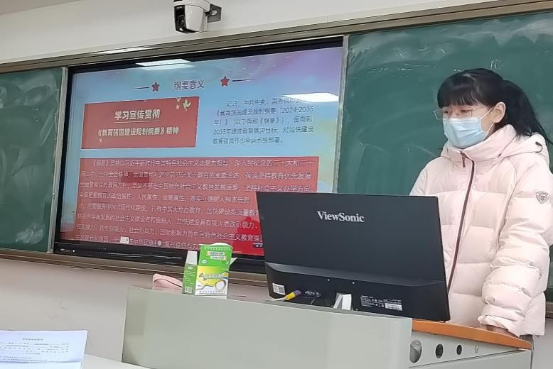 随后,翁艾迪同志从总体要求、主要目标、重点任务等方面带领支部成员学习贯彻《教育强国建设规划纲要(2024—2035年)》(以下简称《纲要》)。《纲要》是在我国迈上全面建设社会主义现代化国家新征程、向第二个百年奋斗目标进军的关键时刻,党中央、国务院颁布实施的教育事业发展纲领性文件。翁艾迪表示,作为学生党员,要把学习贯彻《纲要》与学习贯彻习近平总书记关于教育的重要论述,特别是在全国教育大会上的重要讲话精神和习近平同志《论教育》结合起来,从教育家精神中汲取精神养分,在最能吃苦的年纪“自找苦吃”,激发自强不息、百折不挠的精神力量,锤炼迎难而上、担当作为的过硬本领,涵养家国天下、民胞物与的博大情怀。