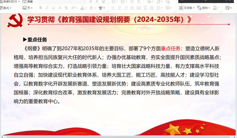 随后,胡玉娜同志领学了《教育强国建设规划纲要(2024—2035年)》(以下简称《纲要》)的相关内容。她介绍道,中共中央、国务院印发了《纲要》,面向到2035年建成教育强国目标,对加快建设教育强国作出全面系统部署。《纲要》要求坚持党对教育事业的全面领导,明确了到2027年和2035年的主要目标,部署了9个方面重点任务,并明确了要建设教育强国,就必须完善党委统一领导、党政齐抓共管、部门各负其责的教育领导体制。胡玉娜同志还对《纲要》的各项内容进行了更为细致的讲解和说明。