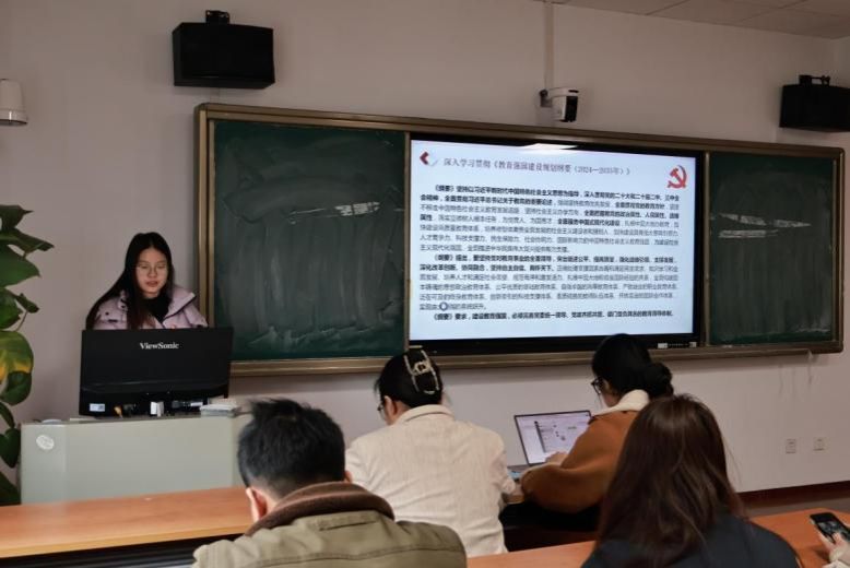 接着,支部组织党员深入学习《教育强国建设规划纲要(2024—2035年)》。结合实际,深入分析如何在教育中落实纲要要求,推动教育高质量发展。这要求以纲要为指引,积极探索创新教育教学方法,为培养德智体美劳全面发展的社会主义建设者和接班人贡献自己的力量。