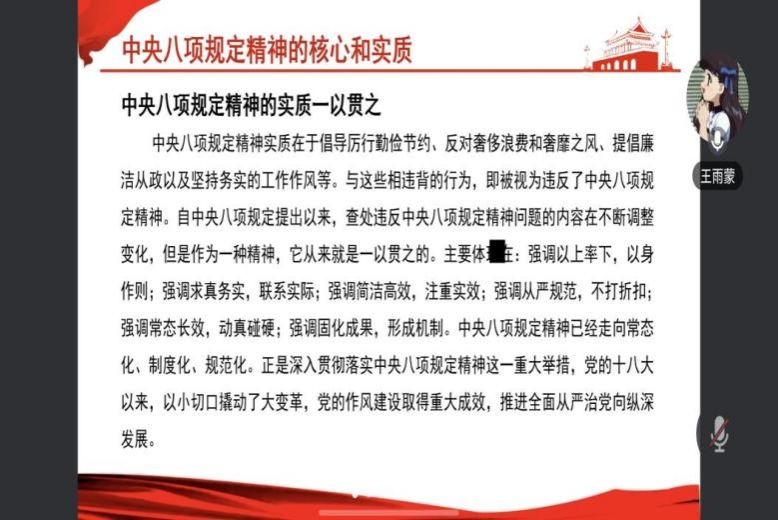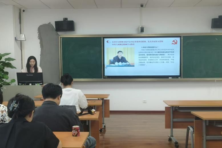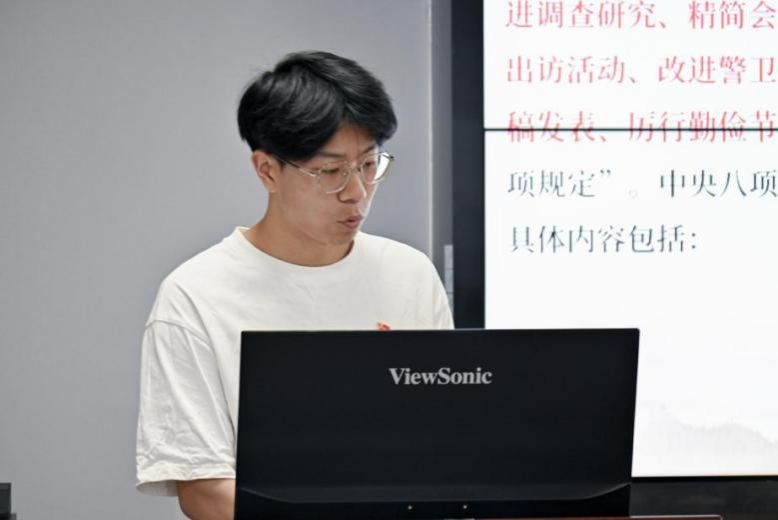 活动第二项,支部党委书记申紫莹带领党员们进行专题学习。在第一部分,党员们系统学习了中央八项规定的历史背景、核心内涵及精神实质。中央八项规定自2012年出台以来,成为改进工作作风、密切联系群众的重要准则,其精神是对全党同志的共同要求,体现以上率下的示范作用。