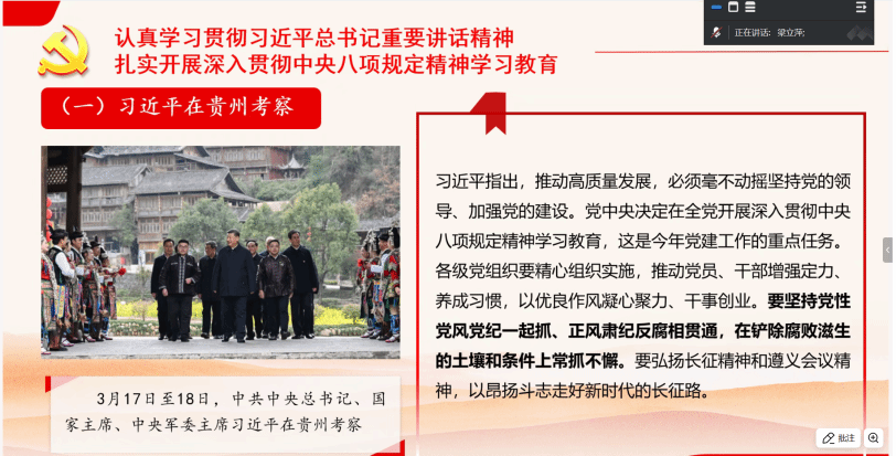 随后,黄淑玲同志领学,组织支部成员集中学习习近平总书记在贵州、云南考察时关于深入贯彻中央八项规定精神学习教育的重要讲话。学习过程中,她带领大家深刻领会党中央决策部署,强调将学习成果转化为推动学校高质量发展的动力,具体包括巩固深化主题教育和党纪学习教育成果、密切党群干群关系、推进中国式现代化建设等方面。此次学习教育不仅是纵深推进全面从严治党的重要举措,还是巩固党的执政基础的必然要求,更是推动学校各项工作高质量发展的有力保障。