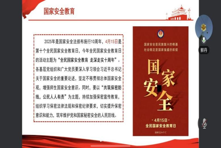 第二部分,由鲜丹同志带领大家深入开展国家安全教育。2025年是国家安全法颁布施行10周年,4月15日是第十个全民国家安全教育日,今年全民国家安全教育日的活动主题为“全民国家安全教育 走深走实十周年”。 总体国家安全观是我们党历史上第一个被确立为国家安全工作指导思想的重大战略思想,是中国共产党和中国人民捍卫国家主权、安全、发展利益百年奋斗实践经验和集体智慧的结晶,是马克思主义国家安全理论中国化的最新成果,是习近平新时代中国特色社会主义思想的重要组成部分,是新时代国家安全工作的根本遵循和行动指南。总体国家安全观是在维护和塑造中国国家安全的新时代伟大斗争实践中产生并不断丰富发展的。总体国家安全观的关键是“总体”。强调大安全理念,涵盖诸多领域,而且将随着社会发展不断动态调整。总体国家安全观的核心要义,集中体现为“十个坚持”。“一个总体”“十个坚持”有机融合、有机统一,凝结着我们党坚持和发展中国特色国家安全的宝贵经验,反映了以习近平同志为核心的党中央对国家安全工作规律性认识的深化、拓展、升华,体现了理论与实践相结合、认识论和方法论相统一的鲜明特色。