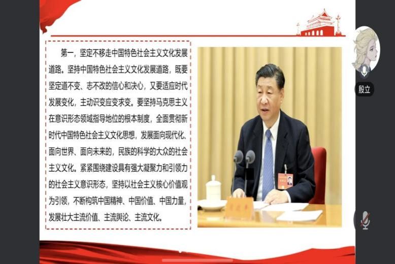 接下来,赵书晗同志领学了加快建设文化强国的相关内容。她先介绍了目前党在文化建设方面取得的成就,她指出,党的十八大以来,我们坚持把文化建设摆在治国理政突出位置,作出一系列重大部署,形成新时代中国特色社会主义文化思想,推动文化建设在正本清源、守正创新中取得历史性成就。随后,赵书晗同志强调了加快建设文化强国要采取的行动。