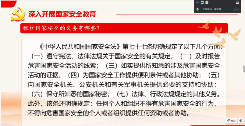 第二党小组的汪庆同志以生动平实的语言,围绕网络安全、信息安全、经济安全、个人隐私保护等主题,为同学们全面阐释了国家安全的丰富内涵。她指出,国家安全不仅仅是“国家大事”,也是我们每位普通公民的共同责任。她鼓励大家提升安全意识,主动学习国家安全相关知识,遇到可疑情况要及时上报,切实做到“维护国家安全,人人有责”。